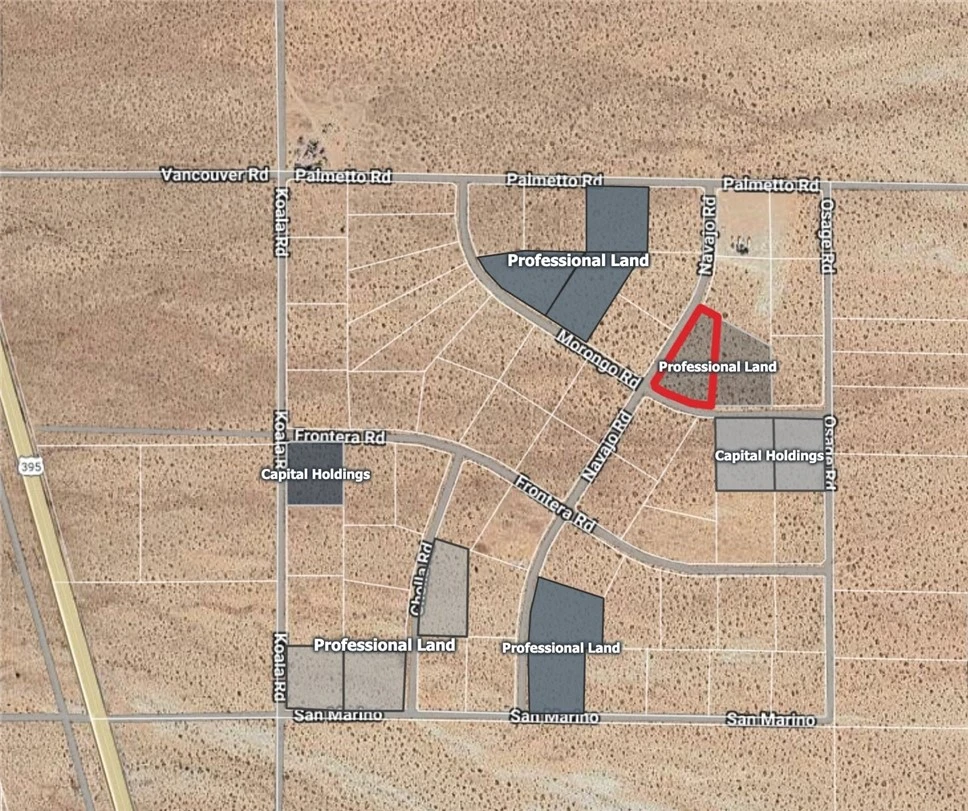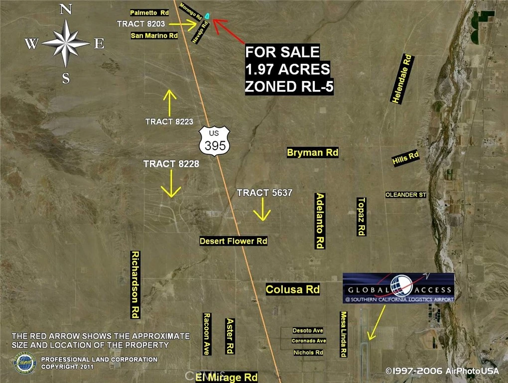PRIME 1.97-ACRE CORNER RESIDENTIALLY ZONED LAND PARCEL IN THE ADELANTO AREA. IT IS SITUATED AT THE NORTHEAST CORNER OF MORONGO AND NAVAJO, TO THE NORTH OF THE SOUTHERN CALIFORNIA LOGISTICS AIRPORT, AND IN CLOSE PROXIMITY TO THE ADELANTO CITY LIMITS. About 0.59-miles east of U.S. Hwy 395, about 3.79-miles north of Oleander, and about 3.79-miles north of the Adelanto city limits. Adelanto is home to the Adelanto Industrial Parks. These Industrial Parks are home to hundreds of industrial companies. This 1.97-acre property is located about 10.2-miles to the north of these Industrial Parks. This property also lies about 7.14-miles northwest of the Southern California Logistics Airport, which is poised to become one the most important cargo airports in the nation. The parade of billion dollar companies like Boeing, General Electric, FedEx, Red Bull, has already begun at the Southern California Logistics Airport. This 1.97-acre is in recorded Subdivision Tract 8203 in the unincorporated area of San Bernardino County. RL-5 zoning would permit one single family home on this property, subject to the development approval and requirements of the County of San Bernardino.