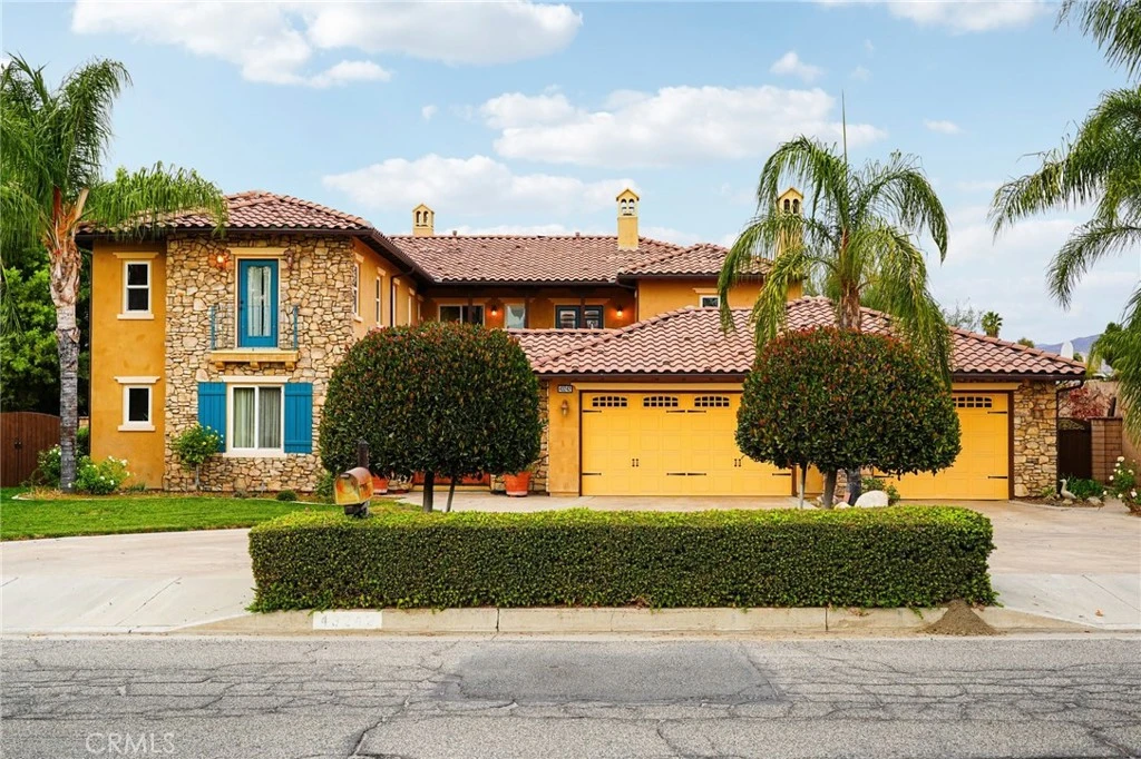 An Incredible Opportunity to Own a One-of-a-Kind Custom Masterpiece! Nestled on a 20,038 SqFt lot with breathtaking views, this custom-built home offers the rare chance to own a truly exceptional property, crafted by the original owners. With 4,467 SqFt of living space, this 5-bedroom, 5.5-bathroom home combines luxury and elegance. The striking circular stamped and stained concrete driveway leads to the grand entrance, revealing sweeping views of lush orange groves. Enter through the wide, custom-crafted mesquite wood front french door, complete with custom hardware and a skeleton key—ushering you into a home that blends Old European charm with modern sophistication. Inside, rich wood finishes, travertine stone, and upgraded carpet create an atmosphere of timeless elegance. The open-concept floor plan, bathed in natural light, features arched entryways, custom wrought iron balusters, crown molding, and tall baseboards. Custom interior doors and dual-pane windows add to the luxury. Relax by one of the three fireplaces, located in the living room, primary bedroom suite, and courtyard. The dual-zone HVAC system ensures comfort for both levels, while ceiling fans and custom curtains complete the home’s design. The chef’s kitchen is a dream, with granite countertops, upgraded cabinetry with pull-outs and crown molding, a six-burner luxury stove, stainless steel appliances, a butler’s pantry, walk-in pantry, and built-in desk. Two spacious downstairs bedrooms, one with an attached ¾ bath, offer flexible living options. The primary suite features arched entryways, balcony access, a cozy sitting area with a fireplace, and a custom walk-in closet. The spa-like primary bath includes a soaking tub, dual vanities, a wet bar, built-in shelves, and a walk-in shower with dual showerheads. Upstairs, the guest bedroom with a tray ceiling, walk-in closet, and French balcony offers orchard views. Guest bathrooms are equipped with walk-in showers, double sinks, and custom wood cabinetry. Enjoy the built-in library or relax in the central courtyard with a fountain, Spanish tile flooring, covered patio, and fireplace. The backyard includes a BBQ island, seating area, and fruit trees under a wood patio cover. RV access, an oversized three-car garage with storage cabinets, wash sink and pull through add convenience. This is a rare opportunity to own a custom home that reflects unmatched craftsmanship and timeless beauty. Don’t miss out on this one-of-a-kind property!