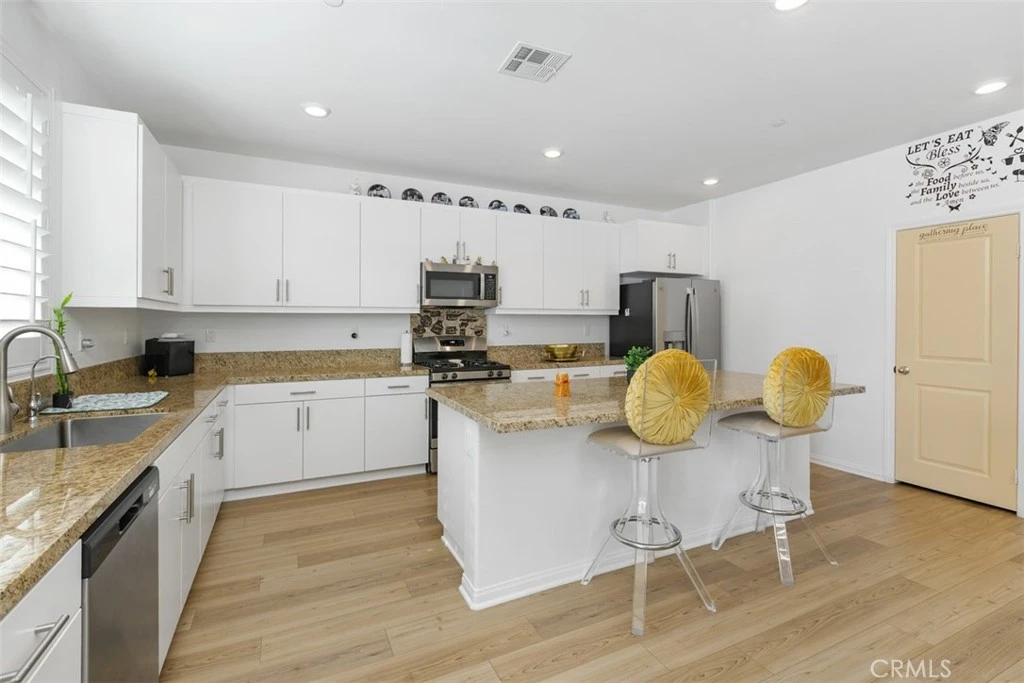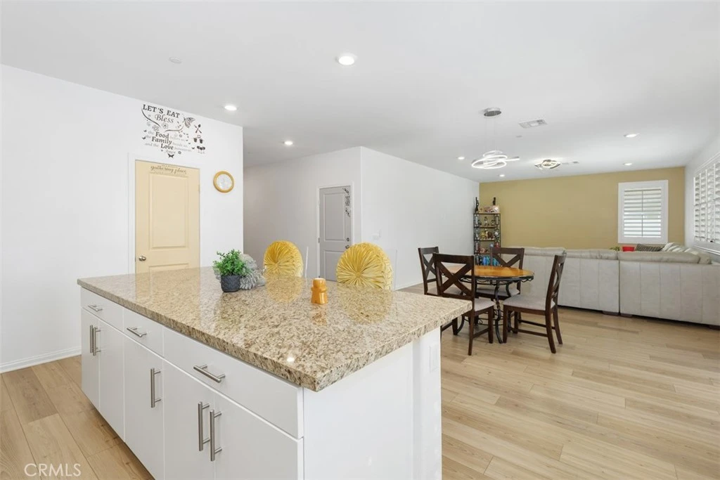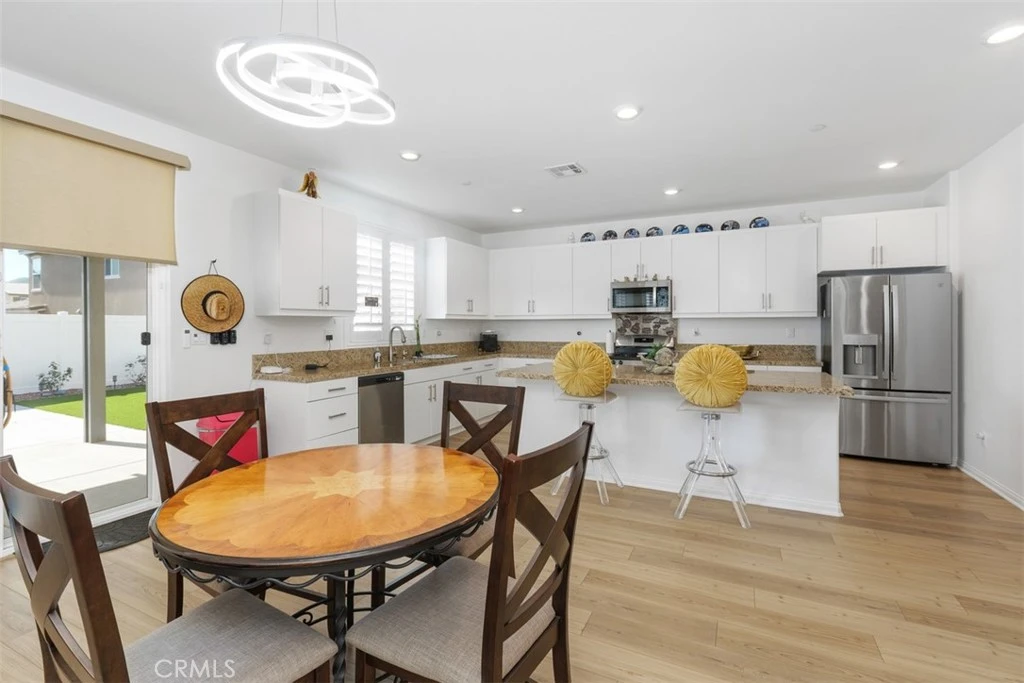 Welcome to Colt Ridge in Hemet – move-in ready and beautifully designed! This two-story home offers 4 bedrooms, 3 full bathrooms, and approximately 2,710 sq. ft. of living space with a 3-car garage. An extended concrete driveway and inviting front porch create great curb appeal. The flexible floor plan includes a main-level bedroom and full bathroom, ideal for guests or multi-generational living. The main level features upgraded flooring, along with modern lighting and ceiling fan fixtures throughout. The spacious Great Room flows seamlessly into the open-concept kitchen with white cabinetry and a large walk-in pantry, and dining area. The kitchen features a large center island, granite countertops, stainless steel appliances, and ample cabinetry. Sliding glass doors lead to the backyard with a covered patio with 3 stylish outdoor lighting & fan fixtures, a generous concrete area, and low-maintenance artificial turf. Upstairs includes a spacious primary suite with an en-suite bathroom and walk-in closet, plus a versatile loft, two additional bedrooms, a full bathroom, and an upstairs laundry room. Additional features include a Tesla charging station in the garage, a water softener and filtration system, and an energy-saving solar system. Colt Ridge residents enjoy access to a recreation center, pool, spa, and BBQ areas. Conveniently located near Diamond Valley Lake, shopping centers, dining, and entertainment, including Village West Shopping Center, Hemet Plaza, Hemet Mall, and Soboba Casino. Move-in ready and offering space, functionality, and community amenities — don’t miss this opportunity.