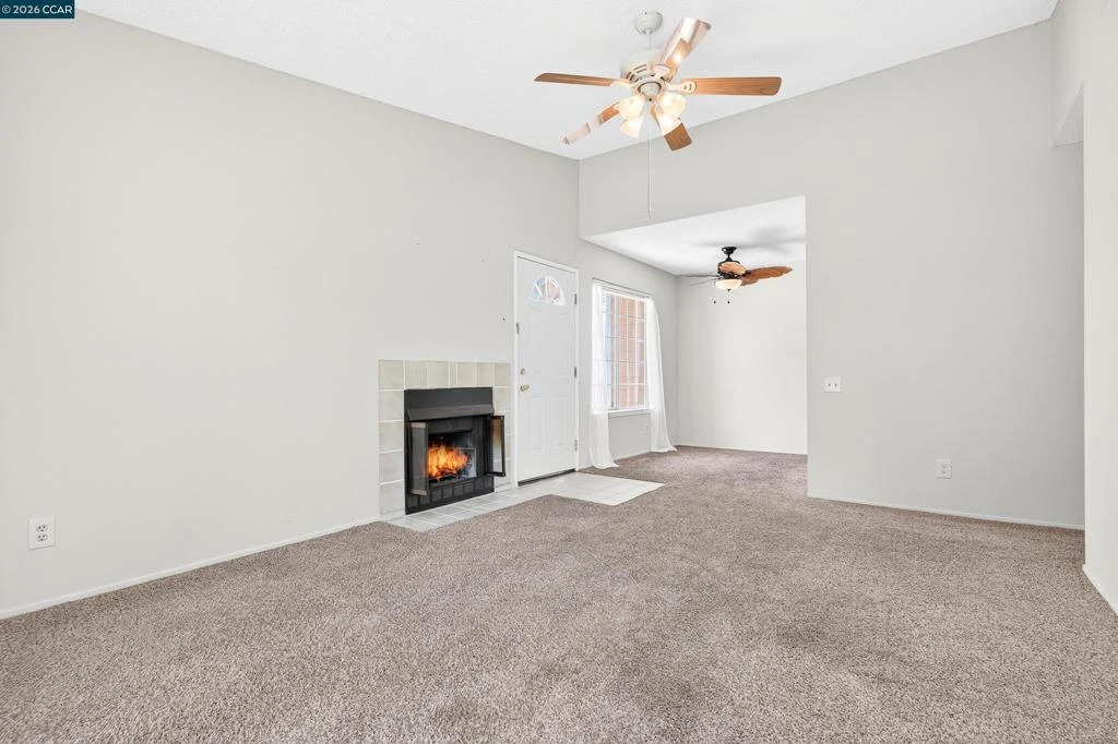 Open House this Saturday & Sunday 1-4pm! Top-floor end unit nestled in one of Hercules' most desirable communities. Bathed in natural light, the spacious living room boasts tall ceilings, a cozy wood-burning fireplace, and direct access to a private balcony overlooking lush greenery, ideal for relaxing or entertaining. The kitchen is a standout, featuring sleek quartz countertops, modern stainless steel appliances, a deep sink with updated fixtures, refinished cabinetry, and new flooring. The primary bedroom is a peaceful retreat with vaulted ceilings, dual closets, and a private powder room. A generously sized second bedroom offers plenty of storage, perfect for guests or a home office. Additional highlights include in-unit laundry hookups and dedicated parking with ample guest spaces. Just steps from the sparkling community pool, and conveniently located near scenic walking trails, parks, dining, shopping, public transportation, and major freeway access, this home offers the ideal blend of comfort, style, and convenience for Bay Area commuters.