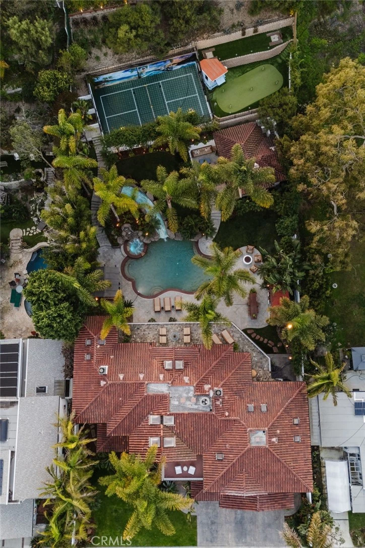 Discreet. Elevated. Resort-Inspired. Set on the third-largest lot in Hermosa Beach, Hidden Hermosa is a rare, resort-style estate blending exceptional scale, privacy, and a deep connection to nature. Spanning over half an acre, the property feels worlds away from the coast while remaining just moments from the beach, downtown Hermosa and Manhattan Beach, and the Valley-Ardmore greenbelt. Inspired by the timeless elegance of Montecito and Santa Barbara–style compounds, the home presents understated sophistication from the street before unfolding into a lush sanctuary. Mature palms, bamboo, and layered tropical landscaping surround the estate, creating a tranquil retreat enhanced by the valley setting, which offers calm evenings, minimal coastal wind, and sound that carries inward rather than outward, ideal for entertaining and everyday serenity. The main residence spans approximately 7,400 square feet and offers six bedrooms, including five upstairs and one on the main level, complemented by a fully detached one-bedroom ADU guest house providing complete independence. Soaring 25-foot ceilings, expansive glass, and French doors create seamless indoor-outdoor flow, while warm wood floors, exposed beams, and custom cabinetry bring refined comfort throughout. Open-concept living spaces extend effortlessly to the backyard grounds, supported by a Savant home automation system, private movie theater, and thoughtfully updated amenities. Upstairs bedrooms enjoy terrace access overlooking the grounds, while the primary suite serves as a true retreat with vaulted ceilings, fireplace, direct outdoor access, a custom walk-in closet, and a spa-like bath with serene garden views. Outdoors, the estate operates as a self-contained resort, anchored by a lagoon-style saltwater pool and spa with waterslide and zip line. Entertaining areas include an outdoor kitchen, fire pit, gazebo, dining spaces beneath towering palms, a 1,000-square-foot multi-sport court, putting green, horseshoe pit, and outdoor shower. The guest house sits quietly within the gardens, visible yet fully separate, offering a peaceful retreat for extended stays, guests, or creative use. A refreshed garage with high-gloss floors, abundant storage, and a Tesla charging station adds convenience. Tucked within a quiet cul-de-sac yet minutes from the sand via a hidden cut-through, Hidden Hermosa is a once-in-a-generation coastal compound, defined by scale, serenity, and luxury.
