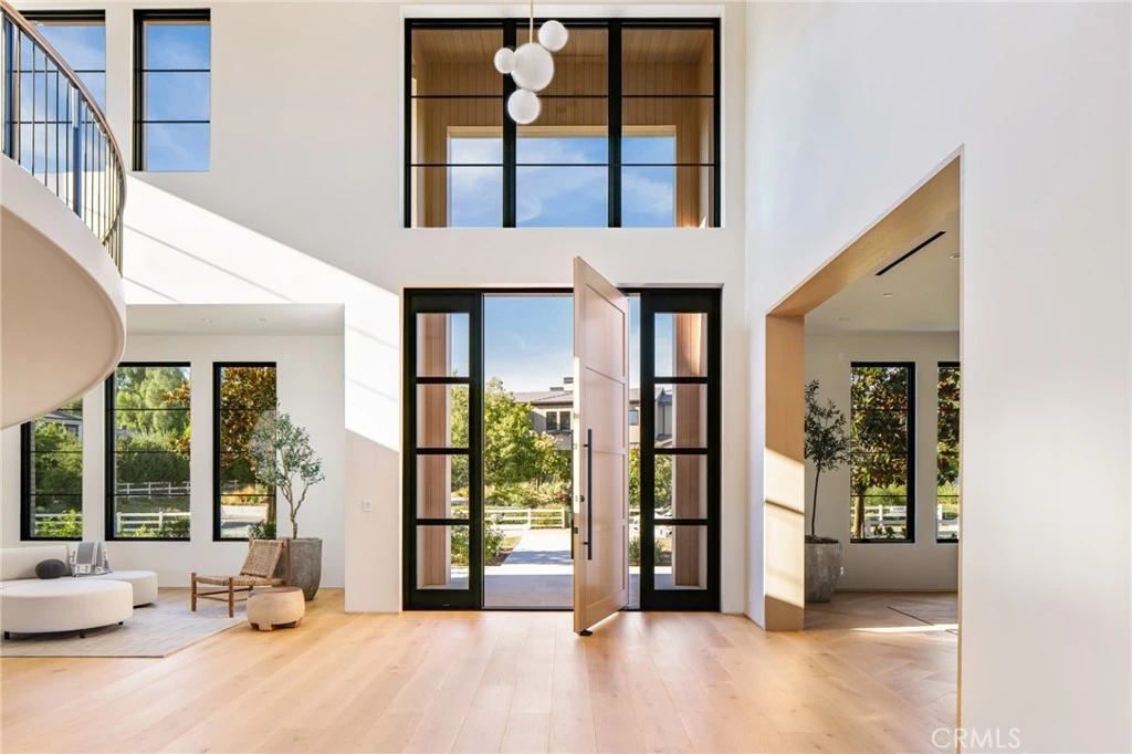 This absolutely gorgeous, new custom estate features beautiful pastoral views, is nestled on a lushly landscaped two acre lot, and is sited at the very end of a scenic cul de sac. The superb open floor plan is flooded with natural light and is highlighted by excellent quality finishes throughout. Amenities include a stellar chef's kitchen (plus a prep kitchen) with four ovens and two islands, one with counter seating, adjoining the sunny breakfast room, all opening to the spacious family room with large stone fireplace and siding walls of glass leading to a large, covered outdoor patio with skylights and full barbecue center. Additional amenities include a gracious formal dining room with glass encased, refrigerated wine wall, beautiful custom office with huge picture windows, a stunning home theater with acoustic paneled sound walls & back-lit coffered ceiling, adjoining entertainers lounge/game room with wet bar, large gym with a motorized opening wall, massage area, and a full bath that includes a steam shower & sauna, plus there is an upstairs bonus room/loft. There are seven generous en suite bedrooms in the main house, four upstairs and two on the main floor. The superb primary suite offers a vaulted, open beam ceiling, full wall windows, white oak floors, a stone fireplace, deluxe dual baths with a shared, oversize walk-in shower, a big soaking tub, room sized, glass fronted custom closets and a big sitting balcony capturing the sunset views. The nicely private grounds include a full guest house, a big sparkling zero edge pool with oversized Baja shelf, a large spa, covered patio, mature trees, and a big private yard with lot's of grass & play areas, plus garages for 7-cars finished with gleaming epoxy floors, plus there is additional off street covered parking. This luxurious home exemplifies the essence of the relaxed, indoor/outdoor California lifestyle.