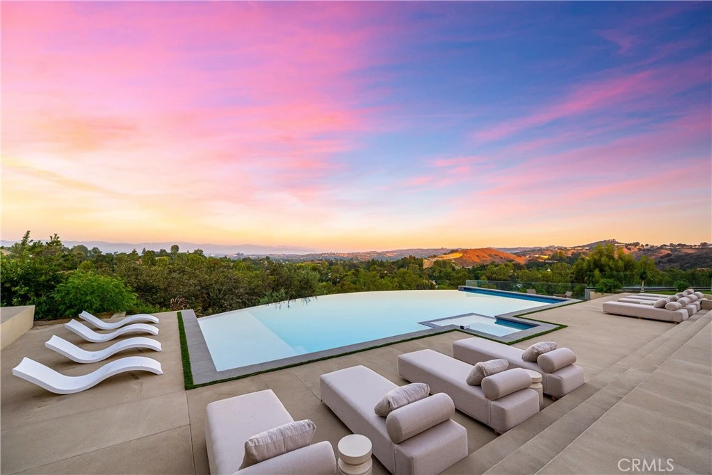 Perched on a pristine 1.6-acre lot in the prestigious Ashley Ridge enclave of Hidden Hills, this newly constructed estate is a masterpiece of modern luxury and design. From the moment you step through the custom front door, you're welcomed into a world of refined elegance. A breathtaking two-story foyer crowned by a full glass ceiling floods the interior with natural light, setting the stage for the home's extraordinary ambiance. The expansive open floor plan is designed for both grand entertaining and effortless daily living. At its heart is a chef’s dream kitchen featuring a large center island with counter seating, a spacious breakfast area, and an adjoining butler’s pantry equipped with a separate catering kitchen. The kitchen flows seamlessly into a spectacular great room with sliding glass walls, a two-sided fireplace, and an adjacent living lounge complete with a stylish seating bar and a glass-enclosed, temperature-controlled wine display. Additional highlights include a formal dining room, a sunlit private office with picture windows, a state-of-the-art home theater with acoustic fabric walls, a large game room, and an oversized gym and spa area featuring a steam shower and sauna. Upstairs, a dramatic vaulted den with open-beam ceilings and a full wall of glass overlooks the beautifully landscaped grounds. With six generous en suite bedrooms—two on the main level and four upstairs—this home offers both comfort and privacy. The opulent primary suite is a true sanctuary, complete with a fireplace, two luxurious bathrooms (each with a soaking tub), custom walk-in dressing rooms, and a private balcony showcasing sweeping views of the city lights and rolling hills. The resort-style backyard is equally impressive, featuring a stunning zero-edge infinity pool and spa, over 2,000 square feet of covered outdoor living space with a fireplace and full barbecue kitchen, and expansive lawn areas perfect for recreation or entertaining. This trophy estate delivers a rare blend of architectural brilliance, top-tier amenities, and an unbeatable location on one of Hidden Hills' most coveted streets.