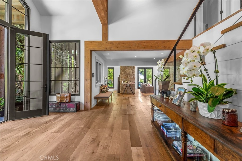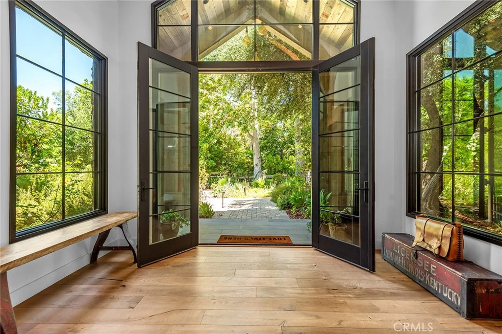 Sited at the very end of a private drive, and nestled on a quiet knoll, this beautiful modern farmhouse is highlighted by the lushly landscaped and serene 3-acre lot that features sweeping pastoral and city lights views. Model sharp throughout, amenities include a chef's gourmet kitchen, a spacious family room with huge picture windows that showcase the stunning grounds, a casual living room with volume ceilings & lounge area with wet bar, a custom office, and five, sunlight filled bedrooms, including the generous primary suite with all stone bath, oversize closet, and a big view balcony overlooking the scenic vistas. The lush, verdant grounds are highlighted by a sparkling pool & spa nestled against a backdrop of mature trees, a covered patio with an adjoining barbecue center, and gentle walking paths to your own, farm to table garden area, plus a chicken coop, bocce ball court, and various destination areas to simply relax, take in the scenic natural beauty, and soak up the views. This home truly offers the seamless, indoor-outdoor living experience that is so sought after today. With it's prime location within Hidden Hills, and close to nearby shopping and the highly rated area schools, this one-of-a-kind home and property has much to offer. (See the floor plan included with the photos as provided by CubiCasa).