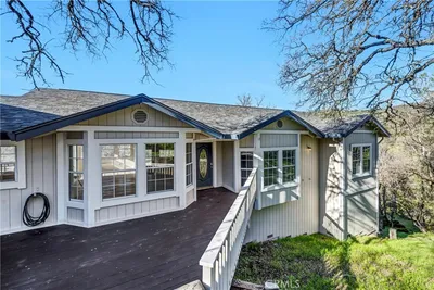 Welcome to an exceptional lakefront retreat on sought-after North Shore Drive in the gated community of Hidden Valley Lake. Built in 2019, this stunning 5 bedroom, 3.5 bath, approximately 2,982 square foot two-level home offers a rare opportunity to enjoy true waterfront living with breathtaking views of the Hidden Valley Lake. Enjoy OWNED SOLAR + EV Charger for energy efficiency! The main level is designed to maximize both comfort and scenery, featuring vaulted ceilings and an open-concept floorplan filled with natural light. Rich bamboo flooring flows throughout the living spaces, creating a warm and inviting atmosphere. The spacious living room is anchored by a cozy propane fireplace and seamlessly connects to the dining area and kitchen — perfect for entertaining or simply relaxing while taking in the lake views. The kitchen is both stylish and functional, complete with a large island with sink, propane range with hood, double oven, and a generous pantry for storage. Just off the main living space is the indoor laundry suite for everyday convenience. Also on the main level are two guest bedrooms and a well-appointed guest bath featuring a tile tub/shower combination. The primary suite is a true sanctuary, offering peaceful lake views and a luxurious ensuite bath with a large jetted soaking tub, expansive walk-in tile shower, and double sink vanity. Downstairs, the home continues to impress with durable stained concrete flooring throughout and a spacious second living area featuring oversized sliding glass doors that frame the lake and provide seamless indoor-outdoor living. Two additional guest bedrooms on this level each feature sliding glass doors for easy access to the outdoors and lakefront. A guest bath with tile walk-in shower serves this lower level. Step outside to enjoy multiple covered patio spaces designed for year-round enjoyment. The upper patio showcases a beautiful pine-lined ceiling and expansive lake views, while the lower level opens to a paver patio, lush lawn, and swaying palm trees. Unwind in the large spa overlooking the water or stroll down to your own beach with direct lake access and room to add a private dock. This is a rare chance to own a newer construction lakefront home in one of Hidden Valley Lake’s most desirable locations — offering space, style, and the ultimate waterfront lifestyle.