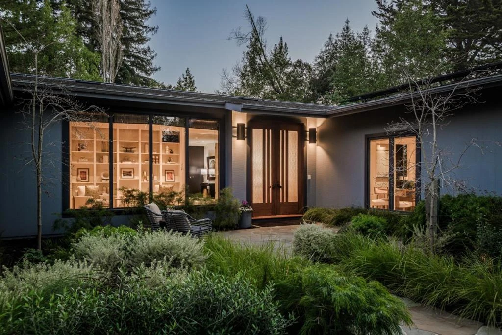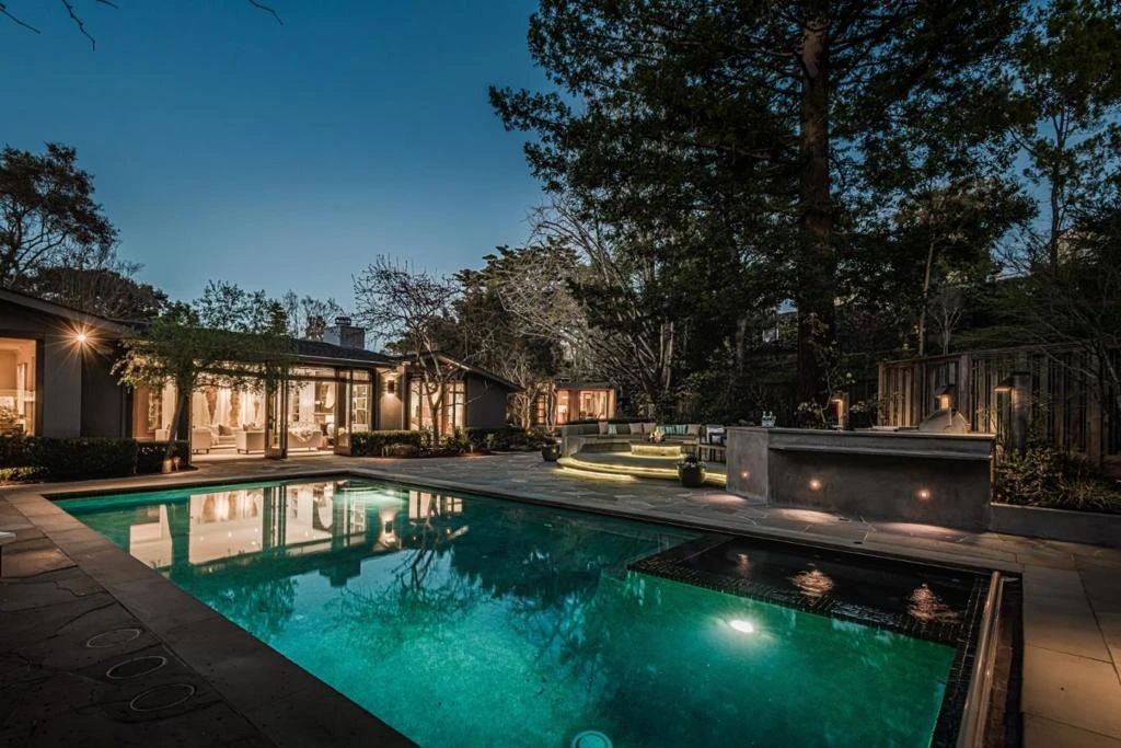 Lower Hillsborough Mid-Century Modern Masterpiece. Walls of glass, soaring ceilings, and resort-caliber grounds define this iconic single-level estate set on a mostly level .716-acre (31,192± sf) lot along one of Hillsboroughs most coveted streets. The 4,670± sf residence showcases a gallery-style entry leading to dramatic living and dining rooms with limestone and granite fireplaces, expansive scale, and seamless indoor-outdoor flow through tall framed glass doors. A perfectly positioned powder room off the main entry offers convenient outdoor access. The stylish chefs kitchen features sleek cabinetry, Wolf 6-burner range with double ovens and grill, 48 Sub-Zero refrigerator, Miele wall oven and microwave, two Bosch dishwashers, and an oversized island with prep sink. An adjacent family room with built-in desks opens to an Ipe deck. The luxurious primary suite opens to the pool, with a spa-inspired bath and heated floors. Three additional ensuite bedrooms provide privacy and comfort. A newly constructed 1,095± sf ADU (2022) with separate address includes full kitchen, living areas, AC, and heated floors. Lush grounds offer pool, spa, pool house with Nano doors, fire pit with built in seating, outdoor kitchen with Lynx appliances, lawn area, solar, EV- outlet, mud/laundry room.