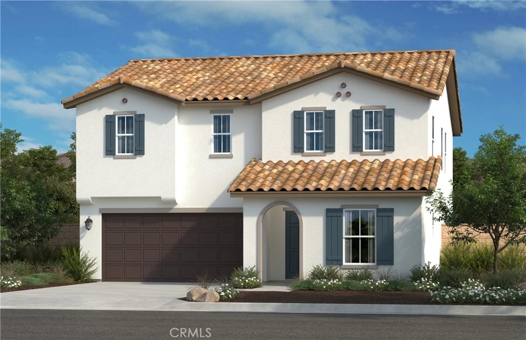 Beautiful Poppy community-Spanish Style all electric two-story home. Includes 4 bdrm, 3 baths, and a loft. Spacious great room. Kitchen boasts beautiful quartz counter tops, white cabinets and Energy Star Certified Whirlpool dishwasher, electric range and microwave hood combo. Vinyl plank flooring throughout downstairs. Large primary bedroom, walk-in closet, walk-in shower, and laundry room upstairs. Solar w/choice to lease or purchase. No HOA. Future community central park, which will feature ball fields, a basketball court and play equipment. Minutes to I-215 via Hwy. 74. Walking distance to local elementary and high schools. Shopping and dining nearby at Menifee Countryside Marketplace and Menifee Town Center. Adjacent to Marion V. Ashley Community Center and Park, which offers a gymnasium, fitness trails and picnic and play areas" Short distance to Lake Perris. Photo is a rendering of the model. Buyer can either lease or purchase the Solar.