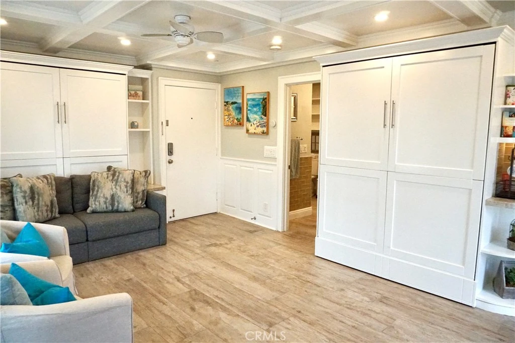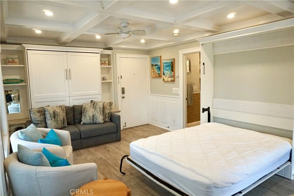 AVAILABLE APRIL 1st! Live on the sand in Huntington Beach’s only beachfront condo community just Steps from the sand! This beautifully remodeled studio with 2 pull down murphy beds comfortably sleeps up to four. This fully FURNISHED unit is completely turnkey, featuring newer cabinetry, stainless steel appliances, and custom wood finishes. The open kitchen flows seamlessly into the living area, where you'll find a built-in TV and stylish decor. The bathroom includes a walk-in closet. Located in the exclusive Huntington Pacific community, residents enjoy resort-style amenities such as a pool, sauna, gym, and an ocean-view clubhouse with a pool table and full kitchen. This gated community with a guard offers a covered, assigned parking spot in a detached garage with extra storage cabinets, plus a guest parking lot with ample space. Everything you need is already here—just bring your clothes! Step outside the gate, and you're right on the beach, just a short walk to the pier, Main Street, and top restaurants and shops.
