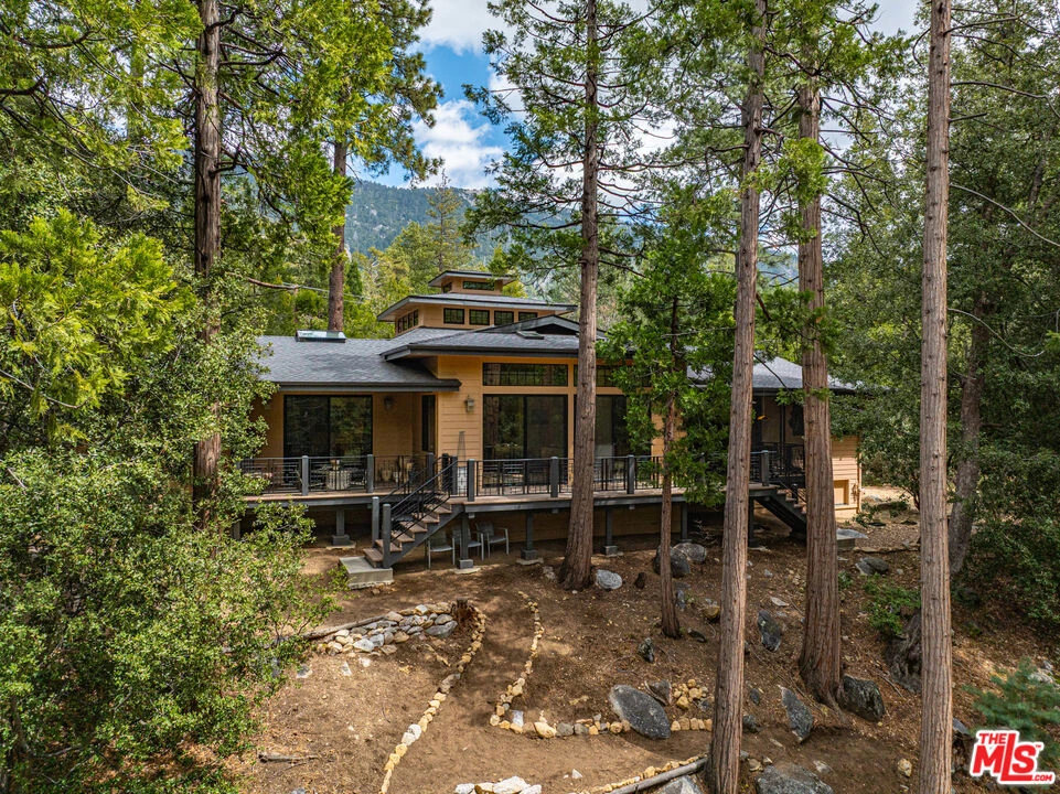 Nestled within the coveted enclave of Fern Valley, this bespoke contemporary lodge offers an unparalleled fusion of modern design and natural splendor. Set on an expansive acre adorned with pines, firs, manzanita, cedar, and 2 types of oak, the residence provides sweeping forest vistas to Strawberry Creek and the majestic Tahquitz Rock. Beyond its fully gated and fenced perimeter lies a sanctuary of sophistication. The main residence features three meticulously designed bedrooms and three bathrooms, complemented by a fourth bathroom in the detached multi-vehicle garage and workshop - a harmonious blend of luxury and practicality. Encircling the home, a wrap-around porch invites moments of serenity, framing the ever-changing tapestry of mountain views. The grand foyer, illuminated by clerestory windows, leads into a voluminous living room where vaulted beamed ceilings, skylights, and a dual-sided wood-burning fireplace converge to create an ambiance of warmth and grandeur. Bamboo flooring and antique artisan-crafted wooden built-ins underscore the home's commitment to natural elegance. At the heart of the residence, the gourmet kitchen offers exquisite stone countertops and a butcher block island with an integrated sink, catering to culinary enthusiasts. A spacious walk-in pantry and adjacent laundry room offer ample storage, ensuring both form and function. The owner's suite serves as a private retreat, featuring a secluded deck, generous dressing room and closet space, and a spa-inspired bathroom complete with a picture window and a Japanese soaking tub, offering a tranquil escape in nature. Guest suites are thoughtfully appointed with large corner windows, walk-in closets, and en-suite bathrooms, ensuring comfort and privacy for visitors. An original Jim Marsh AIA and constructed by renowned builder Terry Griner in 2005 with meticulous attention to detail, this residence has long been celebrated as one of Idyllwild's premier properties and is ideal for full-time living or high-end vacation rental potential.