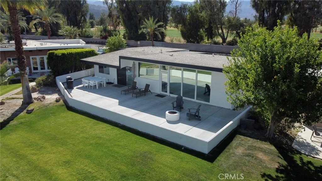 Sun-drenched mid-century modern retreat just steps from the iconic Indian Wells Tennis Garden. This single-level 3-bedroom, 2-bath home is bathed in morning light through dramatic floor-to-ceiling windows spanning the kitchen, dining, and family rooms — seamlessly blending indoor and outdoor living. Currently operating as a successful Airbnb with reservations secured through April, this property offers immediate income potential. Buyer may elect to honor or cancel future bookings. Sold fully furnished for a true turnkey experience. Major system upgrades completed in 2021 include a new tankless water heater, new AC system, and updated PEX plumbing — offering modern efficiency and peace of mind. The private rear patio with fire pit creates the perfect desert lounge setting, while the unique community layout places the rear of each home facing an expansive greenbelt with a sparkling community pool, palm and fruit trees, and wide open views — no direct rear neighbors. Minutes from world-class golf, upscale shopping and dining, and the legendary Coachella Valley Music and Arts Festival and Stagecoach Festival, this is desert living at its most stylish — and profitable.
