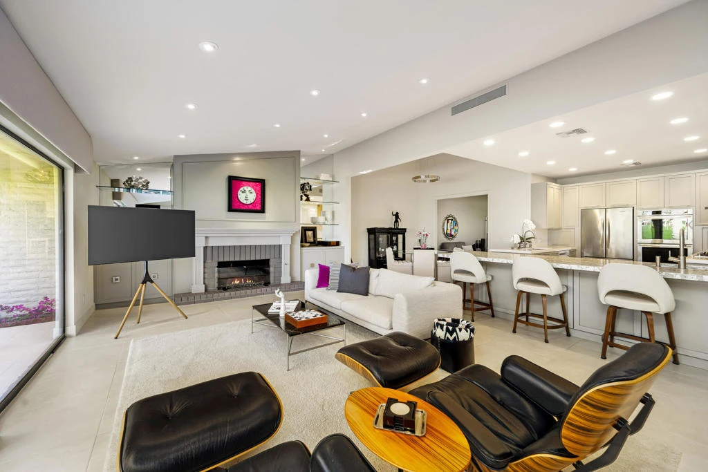 Discover ultimate desert living in this artistically reimagined 3-bedroom, 3-bath partially-furnished residence, perfectly positioned in the hub of prestigious Desert Horizons Country Club in Indian Wells. Set on a prime west-facing lot with a rare triple-fairway view, the home captures sweeping mountain views & unforgettable sunsets, transforming the sky each evening. It's a daily masterpiece you'll never take for granted. Beyond the views and the interior artistry, this home offers an easy-living, vibrant lifestyle. Desert Horizons is known for its welcoming neighbors, dynamic social scene & exceptional amenities. The newly completed clubhouse, dynamic fitness center, and beautiful restaurant & bar are the heart of the community; a place where friendships flourish thanks to a multitude of playfully curated activities. Inside the home, you'll find a thoughtfully redesigned blend of sophisticated style with effortless comfort. The living & dining area are one expansive, light-filled space -- ideal for both intimate evenings and lively gatherings. At the heart of the home is a kitchen that's designed to impress, featuring double convection ovens, dual sinks, two dishwashers, generous prep space & abundant custom storage. It's a kitchen built for entertaining as beautifully as it functions. The primary bedroom suite is a private sanctuary, complete with a truly stunning, spa-inspired bath with custom counter tops and double sinks, two walk-in closets, and plush Fabrica carpet that makes getting out of bed in the morning a lavish delight. Down the hall is a spacious laundry area for exceptional convenience. Every detail has been designed with intention. Recent upgrades include two American Standard HVAC systems, motorized west-facing blinds, a new motorized awning, custom front yard landscaping with updated irrigation, a custom designed entry gate, and a beautifully tiled back patio that seamlessly blends indoor & outdoor living. The home is offered with many essential furnishings. High-end custom pieces that complete the look are available for an absolute great price outside of escrow, allowing you to step into a fully realized aesthetic - a move-in ready, stylishly curated, cohesively customized home.