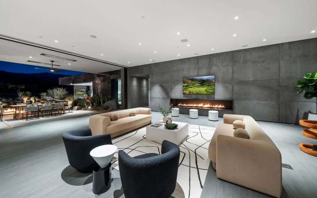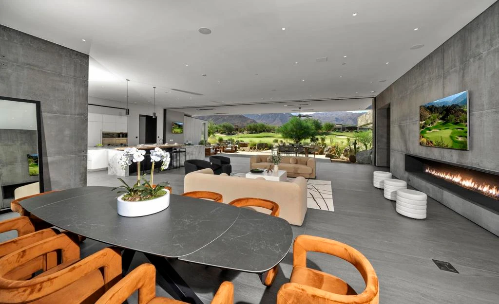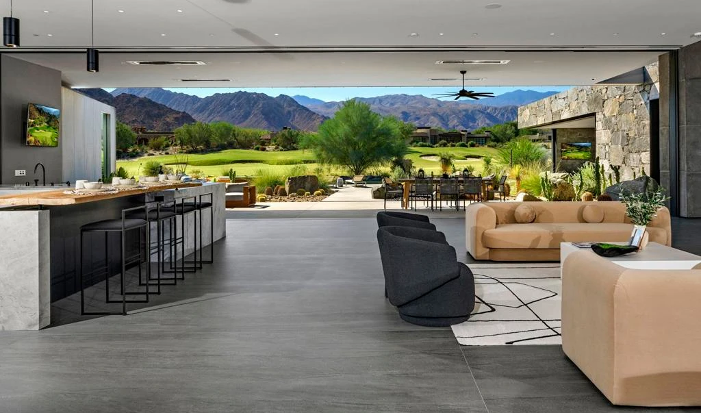 An architectural masterpiece by Sean Lockyer of Studio AR&D, this exquisite estate home is located within the private gates of The Reserve. Exceptional exterior design elements of hand carved slate & stone are enhanced by pour-in-place concrete walls framing the entry gate to the courtyard. Your eyes are immediately drawn to dramatic walls of glass, w/views through the great room to another 58 ft. wall of glass opening to outside views. All this before you step inside the steel entry door to the grandeur of a home that presents itself as a world of serenity & modern majesty. Once inside, you are welcomed by a wall of beauty & function, the Wine Room, holding up to 500 bottles in a rack of custom steel & leather straps, opposite more walls of glass & gardens. The great room & gourmet kitchen have views across a waterway & the 14th fairway to the Santa Rosa Mountains to the south. The steel entry doorway to the spacious primary suite is a remarkable work of art! Once inside you have options for cozy seating at the fireplace, while opening an entire wall of glass to overlook the outdoor beauty of the fire & water features, infinity pool & outdoor living & entertaining areas. Awaiting your personal interior design, to make it your own, is an 85 panel Solar desert retreat quality built by the Canavan Group, featuring 2 guest suites, an office/den, or yoga room, custom cabinetry, Neolith Fusion flooring, granite countertops/walls, CEA Design fixtures & Otiima windows throughout. The Reserve Club offers world class amenities including a Tom Weiskopf-Jay Morrish designed championship golf course, three Trophy Holes and a double-ended practice range. The Club Village includes Clubhouse; Lakehouse for casual dining; Fitness Center with exercise rooms, extensive cardio equipment, Jr. Olympic size pool, Tennis and Pickleball; and Golf Shop.
