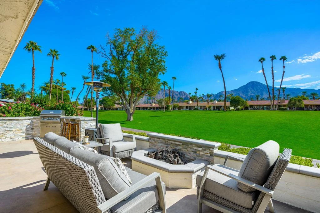 Available Jan. 4th 2026. Spectacular South Mountain & Fairway Views are yours from this Gorgeous 3 Bedroom- 3 Bath Furnished home. The private Courtyard with flowing Fountain welcomes you into this tastefully appointed home perfect for Entertaining with a spacious Open Living Concept. Architectural details include the Entry Foyer, pristine Tile floors, Living Room with Fireplace and TV, Wet Bar with Wine Frig. An upgraded Gourmet Kitchen with an over-sized Island with seating for 4, Quartz counter finishes, Stainless Steel Appliances, warm Cabinetry and Backsplash. Breakfast Nook for 4, Dining area for 6 and Den enhanced by wood beam ceilings, TV for relaxing. Luxurious Master Suite w/ a King Bed, TV and its own Patio access, large Shower and custom Walk-in Closet. Spacious 2nd & 3rd Guest Rooms offer updated en-suite baths & sliders out to their own patios, both offer Queen-size Beds. Take in the breathtaking sunsets while savoring the incredible views of Mt. Eisenhower from your outdoor patio, complete with a gas grill and dining table for six. The community pool is just steps away, offering the perfect setting for relaxation and fun.