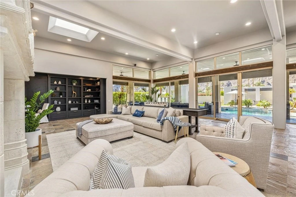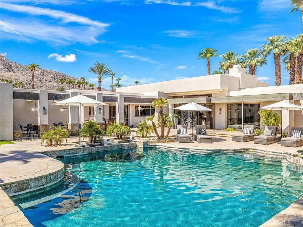 Available December and January, RENTED FEB-MAY 2025 Enjoy Panoramic Mountain Views from this sprawling one-acre renovated estate ideal as a family compound or entertainer's paradise located in the Guard Gated community of Indian Wells. This spacious contemporary Ministrelli-built residence has an enormous guest house equipped with a large great room, full bar, and 2 guest bedrooms with ensuite baths. Laundry room, pool table, shuffleboard. The main house has a living room w/ fireplace vaulted wood-beamed ceilings, dining room, wet bar, designer kitchen w/ stainless steel Miele appliances, family room of kitchen area, Primaray suite with two separate walk-in closets, stand-alone bathtub, walk-in shower, luxurious guest bedrooms with ensuite bathrooms. Laundry room, 3 car garage, golf cart. This ultra-private property inside and out has all-new landscaping, lighting, rock and stone waterfall fountains, sunken tennis/pickleball court, bocce ball court, large pebble-tee pool, spa with fountains, and Cul de sac location. Indian Wells is located near El Paseo and many other numberer shops and restaurants.