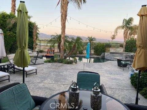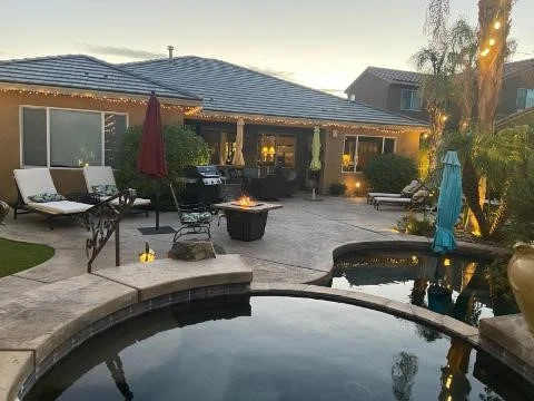 LEASE FOR THE MONTH OF APRIL. Beautiful tropical resort, 3 bed, 2 bath home.(Sleeper couch is a queen, sleeps 2) House sleeps 9. Another twin over full bunk bed can be put in the house to accomodate another 3 sleep) Gorgeous pebble tech salt water pool, extra deep spa with custom stone spillway. Great views of Terra Lago golf course and lake with mountains as back drop. Ample backyard seating areas with propane fire table, outdoor TV and ceiling fan and BBQ. Electrical has been upgraded to 50 amp service. Community has a Golf Course in it's back yard, Clubhouse, Lap Pool & Kids Pool with change rooms and showers, Community Spa, pool table, patio area overlooking a 3 acre lake. Direct cable tv as well as 5G internet included. Close to casino's, Palm Springs, pickleball courts, hiking trails, Coachella Fest, Stagecoach, Acrisure Arena and many more attractions. House is for sale, lease to be written into purchase