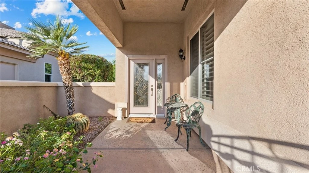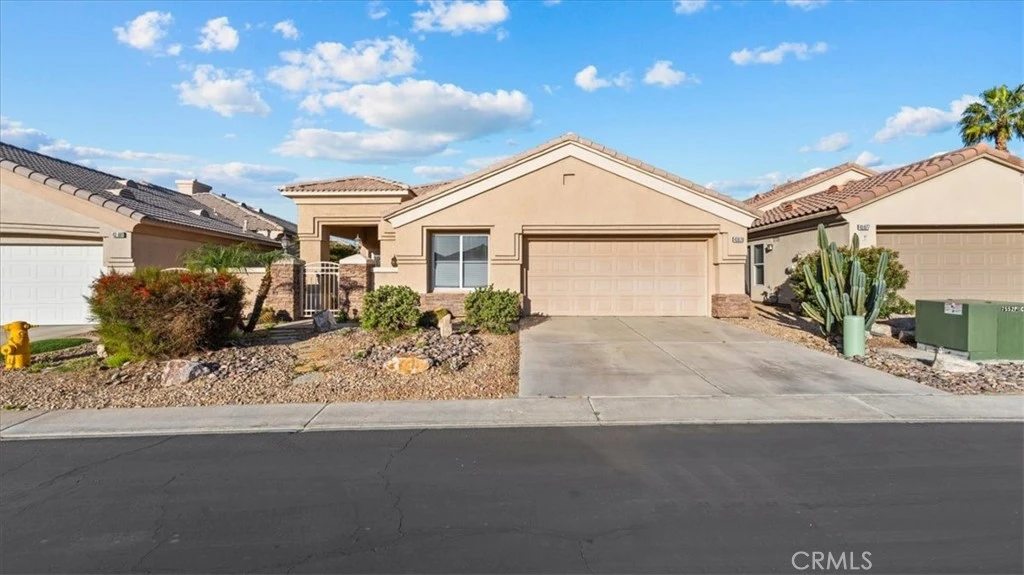 Don't miss your chance to own a stunning home in one of the most coveted locations within Heritage Palms, an exclusive 55+ gated golf course community. Perfectly positioned along the 5th fairway, this residence combines privacy, comfort and breathtaking views. A welcoming stone entry opens to a bright foyer and spacious open concept living area. The large kitchen boasts abundant cabinetry, a pantry, and plenty of counter space, flowing seamlessly into the living room with cozy fireplace. With 2 bedrooms, 2 bathrooms, and versatile den with double doors - ideal as an office or guest room - this home offers both flexibility and function. The primary suite is thoughtfully located on the west side of the home, keeping mornings cool and comfortable. Recent flooring upgrades make this home completely move in ready and truly turnkey. A two-car garage with an additional nook for your golf cart ensures both convenience and practicality. Step outside to a backyard designed for relaxation and entertaining. Enjoy your own sparkling pool and spa while taking in the panoramic mountain views. There is a prolific lemon tree as well. With a west-facing yard, you'll witness some of the most beautiful sunsets in the desert - all from the privacy of your own retreat. Best of all, while you're right on the golf course, this home has had no stray balls in over six years of ownership. Whether you're sipping morning coffee as birds and early golfers pass by, or winding down at night under the glowing skies, this home offers a lifestyle that feels worlds away - yet right in the heart of Heritage Palms.