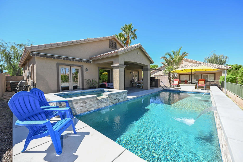 Enjoy the desert life in this beautifully designer-furnished vacation retreat featuring two private primary suites, each with French doors opening to a resort-style backyard with a custom pool and spa.The upgraded kitchen showcases granite countertops, abundant cabinetry and prep space, a sunny breakfast nook, breakfast bar seating, recessed lighting, crown molding, and a convenient pantry located off the laundry room.The open great room is designed for comfortable living and entertaining, offering a spacious dining area, gas fireplace with custom mantel and tile surround, built-in media center with speakers, and French doors that create seamless indoor-outdoor flow. The garage is equally well-appointed with an epoxy floor, built-in workbench, and its own A/C.Step outside to an exceptional outdoor living space perfect for entertaining, complete with a stunning custom pool and spa, covered patio, motorized awnings, fire feature, built-in BBQ, expanded concrete decking, and extensive landscape lighting -- all overlooking a picturesque golf course view.Just bring your swim trunks, golf clubs, and sunscreen and start enjoying the desert lifestyle. Rental includes a utility allowance, DirecTV, Wi-Fi internet, and access to two community pools, spas, and fitness centers. Ideally located near La Quinta, Palm Desert, PGA West, and the Indian Wells Tennis Garden.<owner will be purchasing a new sofa bed for addl house guests in the living room>Jan-Feb-Mar $6,000 | April $7,000 | Nov-Dec-May $4,500 | June through October $3,900 | Annual Lease available for $4,200Inquire for more details, deposits and fees. Small dog with approval and additional fee. No cats. Home furnishings, rates, and availability are subject to change.