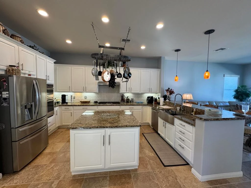 LONG TERM or SEASONAL RENTAL. (TEXT for seasonal rates.) COMPLETELY REMODELED This coveted San Miguel Model is being offered FURNISHED. It was recently PAINTED, NEW flooring, 6'baseboard added, completely remodeled baths and kitchen. Located at end of Cul-D-Sac on premium 15000+ sq.ft. lot. Features formal dining and living rooms area, plus double door Den/office. It also has a separate Family/TV Room and breakfast nook which open to beautifully REMODELED KITCHEN w/custom SOLID Slab Granite Counters and subway tile backsplash. Kitchen is fitted w/quality high end stainless steel appliances, custom hood, 5 burner gas range, FARMERS SINK, newly painted white cabinets w/brushed nickel hardware, plus replaced plumbing fixtures and disposal. The breakfast bar and a center island lend themselves to the perfect setting to entertain. Amongst other things, it also includes a TOP of the line WATER PURIFIER producing alkaline balanced water plus PURIFIER UNIT in garage for entire home. The well appointed master bedroom suite affords a sitting area for those peaceful quality moments. Bathroom has double vanity, the shower remodeled using 8x8 GLASS BLOCK and beach entry w/mosaic shower pan and porcelain tile from floor to ceiling PLUS custom upgraded fixtures. Also included was the NEW 8'x 48'' quality laminate floors thru-out. The extra large walk in closet provides plenty of storage. The guest casita (2nd bedroom) is large enough for King Size Bed, end tables, chest of drawers and sitting area. The casita bathroom was also REMODELED w/walk in shower, including mosaic shower pan, custom rain shower head, fixtures & custom glass and has private door leading to courtyard. The NEW beautiful LOW MAINTAIN custom landscape includes a DEEP ROCK RIVER using Large Boulder and smaller stone. In addition a NEW custom sidewalk w/WATER FEATURE many beautiful miniature slow growing palms and desert plants to give it the curve appeal. Backyard has PUTTING GREEN, additional turf and 12 ft. CUSTOM PAVERS in a 12' circle PLUMBED FOR GAS FIREPIT. Also has movable quality BBQ Island. Home is in beautiful golf course gated community w/Tennis, pickle-ball, bocci ball, State of the word fitness centers, indoor walking areas, billiards, many social clubs with a real community feel and so much more. Close to many golf courses, restaurants, stores, shopping, etc. Search www.SCSHCA.Com for ALL Amenities. A MUST SEE TO APPRECIATE; Make your appointment NO
