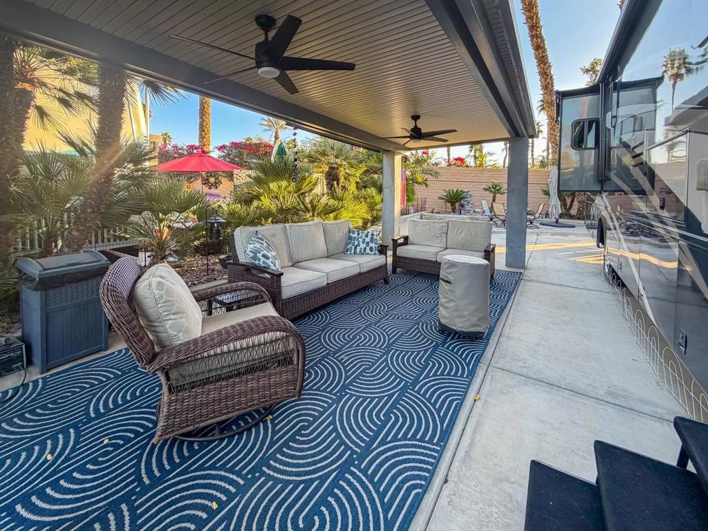 Step into resort living with this inviting pergola lot at Outdoor Resort Indio--a great opportunity to own in one of the desert's premier Class A motorcoach communities. This property offers a comfortable and private outdoor lifestyle with mature landscaping and a raised back patio that expands your living space.The solid-roof pergola provides shade and comfort, enhanced by two ceiling fans for warm afternoons and outdoor seating that makes relaxing with friends easy. A charming water feature at the rear of the lot adds a peaceful ambiance, creating a soothing backdrop for morning coffee or sunset gatherings. Just a short walk from the nearby satellite pool, hot tub, sauna, and laundry, this location blends convenience with resort-style comfort.Whether you're looking for a seasonal getaway or your place in the ORI community, this lot delivers excellent value and lifestyle appeal. Outdoor Resort Indio is a class A only RV resort.