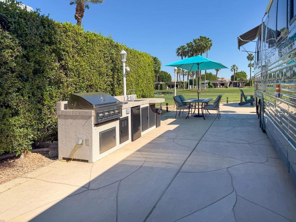 Welcome to a beautifully positioned luxury RV lot at Outdoor Resort Indio, offering both privacy and scenic golf course views in one of the most desirable Class A motorcoach resorts in California. Thoughtfully landscaped and designed for comfort, this lot provides a peaceful retreat while still being conveniently located near the heart of the clubhouse activity -- yet far enough away to avoid pickleball noise.The outdoor living space is ideal for entertaining, featuring a gas fire pit surrounded by four matching chairs with umbrella, plus an additional outdoor dining table with four cushioned chairs and umbrella. A medium-sized outdoor kitchen includes hot water, garbage disposal, refrigerator, one-burner cooktop, built-in BBQ grill, and rated storage -- making it easy to host gatherings or enjoy quiet evenings under the desert sky.The lot also offers a surfaced RV pad and pavers along the side for additional golf cart parking, adding flexibility and convenience. With golf course views, privacy, and a prime location within Outdoor Resort Indio, this property captures the luxury RV lifestyle that Class A motorcoach owners seek -- combining scenery, functionality, and vibrant resort living.Outdoor Resort Indio is a class A RV resort.