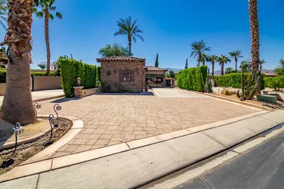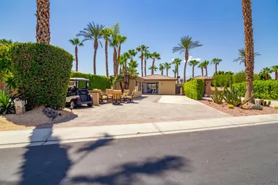 Outdoor Resort Indio is a Class A Motorcoach resort. This is an RV lot. This beautifully designed RV lot with 677 sq. ft. casita at Outdoor Resort Indio combines refined interior design with stunning golf course and lake views. Warm, coordinated textures of brick, stone, and tile create an inviting atmosphere throughout the thoughtfully planned casita.The chef's kitchen features a large stone-topped island with farmhouse sink and seating for six, custom cabinetry, and a full suite of matching KitchenAid appliances, including a full-size refrigerator, wall oven, microwave, dishwasher, cooktop, and warming drawer. A striking custom brick arch and stainless exhaust vent add architectural character, while a pantry and generous storage provide everyday convenience.Vaulted ceilings with exposed beams, ceiling fan, and air conditioning enhance the open living space, highlighted by a large brick fireplace with mantel, leather seating, and a dining area with bench seating. A separate bar area offers its own sink, refrigerator, stone counters, and custom cabinets--perfect for entertaining.The bathroom includes a spacious walk-in stone-tile shower with built-in bench and recessed shelving, along with a large double-door storage area. Four sliding glass door panels open to sweeping north-facing views of the golf course and lakes, seamlessly connecting indoor and outdoor living. Sun screens on every glass door, tile flooring throughout, and cohesive design details complete this exceptional casita in a prime resort setting.