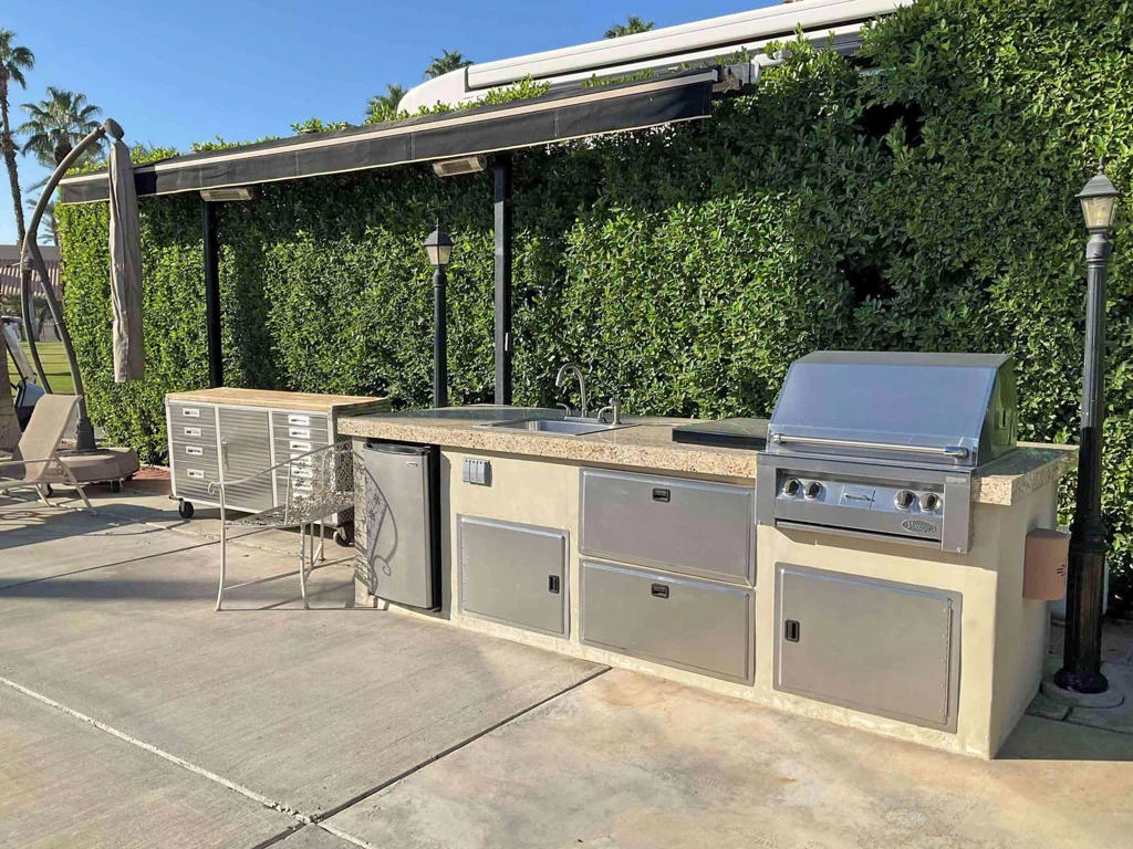 This prime building lot offers breathtaking views in both directions, with a west-facing orientation overlooking a tranquil pond, water fountain, and spectacular sunsets, while the front of the coach faces east. Perfectly situated near all resort activities, it boasts a central location with a golf course view free from errant golf balls and a direct line of sight to the bocce ball courts. Ready to build, the lot has been surveyed and comes with pre-approval for a casita, with all necessary documentation available. The outdoor kitchen is equipped with tiled counters, a BBQ, cooktop, sink, refrigerator, dishwasher, and ample storage, making it ideal for entertaining. Offered unfurnished, this is truly one of the most desirable lots in the resortOutdoor Resort Indio is a Class A only RV resort.