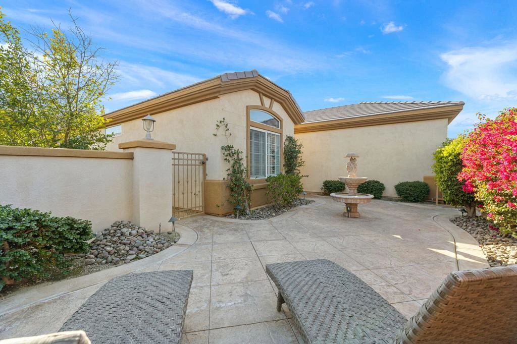 Golf course living at its finest -- wake up and step outside to the brisk morning air, catch the smell of fresh cut grass, hear birds chirping, eye the manicured greenbelt, and sit by your private pool and spa, and wonder why you didn't do this sooner. This MERION model (1,766 SF) sits on a sunny, north-south lot. You'll love the covered patio made for year-round outdoor living. Morning coffee with mountain views, afternoon dips in your own private pool, evening soaks under the desert stars -- this is the daily routine you've earned. An enclosed oversized front courtyard for a relaxing sit, or evening entertaining, greets you before you even walk through the door. Inside, this home has been immaculately maintained. Two spacious bedrooms, two baths, and a den with double doors -- perfect for a home office or reading room. The open great room features a gas fireplace, built-in entertainment center, and dining area that flows seamlessly into the upgraded granite kitchen with cherry wood cabinets and pantry. Pride of ownership is evident here... more home benefits include plantation shutters throughout, ceiling fans, inside laundry with sink, and a 2-car garage with plenty of storage. No hassling with the yard work, as front and rear professionally landscaped. Beyond your backyard, Heritage Palms delivers the lifestyle to match. This guarded, active 55+ community offers 24-hour security and community owned golf course (no initiation fee!). Arthur Hills-designed 18-hole championship course, an updated clubhouse, delicious restaurant, lounge with a generous bar, fitness center, lit tennis & pickleball courts, pools & bubbling spa, group fitness classes, book clubs, hiking groups, theme parties, and event spaces with stunning mountain views. Your social calendar just got a serious upgrade. Contact your Agent today for a private showing! **See the 24-7 Open House Tour in the photos/virtual tour list. **