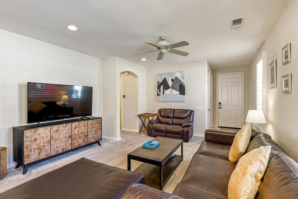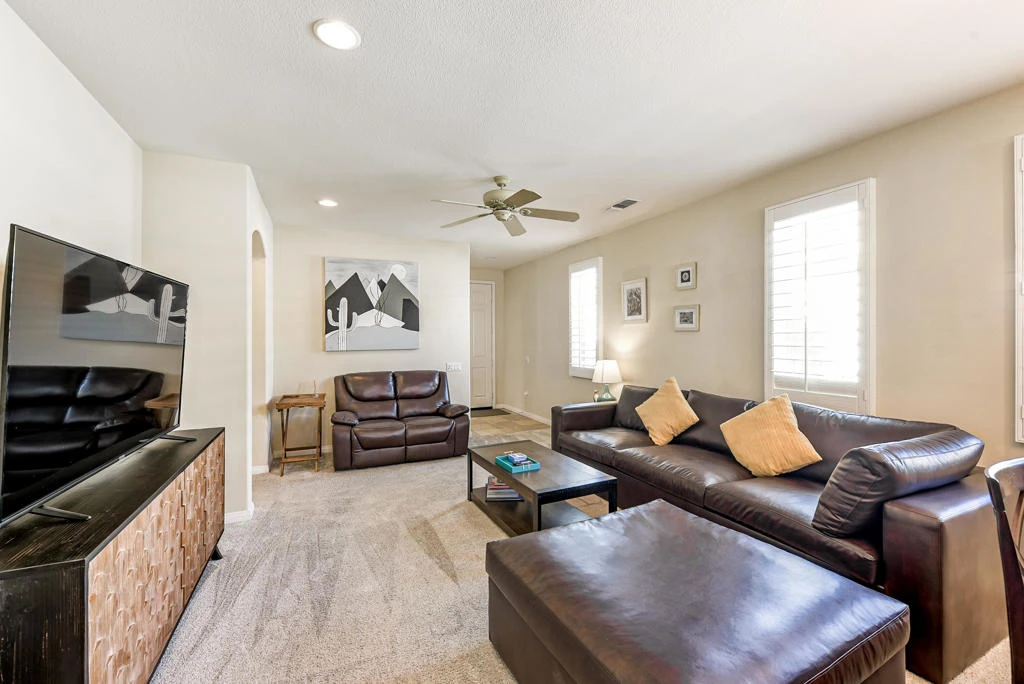 Available now for summer months! This fastidiously maintained San Olivia floor plan was built to 1,374 SF (EST.) in 2005. Everything is just right here because you not only have 2 bedrooms and 2 baths, but also a den, which will have a desk added to it to make it a true home office! There are ceiling fans, recessed lighting & upscale light fixtures on high ceilings, and beautiful plantation shutters on all windows. The kitchen has high quality 42 inch cabinets, granite countertops, and a stool height bar overlooking the dining area and great room. There is a spacious master suite that has dual vanities, a glass enclosed shower, walk-in closet, and slider to the patio. The guest bedroom, guest full bath, and den are located across the home from the master bedroom for maximum privacy. There is a two car attached garage with lots of room for storage and an easy access man-door that leads to the side yard. The rear covered patio runs the full width of the home. Plenty of space here for desert outdoor enjoyment. They have easy-care desert landscaping throughout. Short walks to the dog parks and the Main Clubhouse, which offers an indoor lap pool, an outdoor resort style swimming pool and spa, a fitness center, billiard tables, and so much more. Summer rate available. Seasonal Rental. Rented Jan-April 2027.