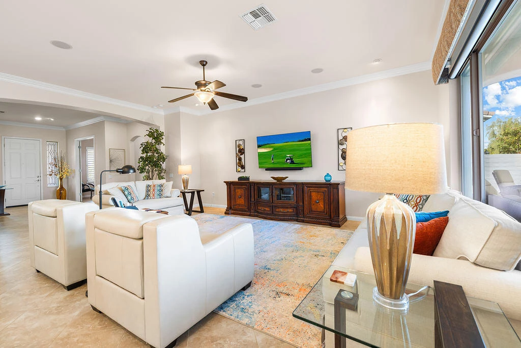 Welcome to your dream retreat in the prestigious Sun City Shadow Hills, a vibrant 55+ community in Indio, California. This stunning 3-bedroom, 2.5-bathroom home is available for seasonal rental and comes turnkey furnished, offering you a seamless transition into resort-style living. Step inside to discover a beautifully appointed interior with an open floor plan that seamlessly blends comfort and elegance. The spacious living area is perfect for entertaining, featuring plush seating and a large flat-screen TV. The gourmet kitchen is a chef's delight, equipped with modern appliances and ample cabinet space. The master suite is a true sanctuary, boasting a luxurious en-suite bathroom with dual vanities and a separate shower. Two additional bedrooms provide plenty of space for guests. Outside, enjoy the serene golf course from your private backyard, ideal for morning coffee or evening cocktails. Enjoy the private pool, spa, BBQ, and fire pit all outside your door. As a resident of Sun City Shadow Hills, you'll have access to world-class amenities, including golf courses, swimming pools, fitness centers, and a bustling clubhouse with a variety of social activities. Located near popular attractions, shopping, and dining options, this home offers the perfect blend of relaxation and convenience. Nearby, you'll find the Shadow Hills Golf Club and Shadow's restaurant. Rented until 3/31/26. Rented 12/1/26 to 3-31/27.