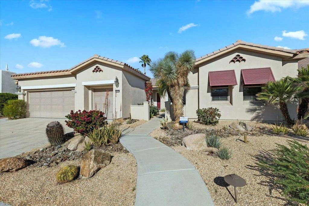 Exceptional golf course home with breathtaking golf, lake, AND mountain views. The elevated patio is a virtual haven for relaxing and enjoying the firepit and built in BBQ. Once inside this San Miguel model, you'll find the same magnificent views from the living room, kitchen, great room, and primary bedroom. The primary bath has a large dual vanity, separate soaking tub, shower and an incredible built in custom closet. The ensuite 2nd bedroom and bath have an outside courtyard entrance and could easily be separated from the main house by another interior door. Think...guests, extended family, a future caretaker, etc. The office is large enough to easily make a 3rd guest room. The garage has loads of built in storage. This home has been impeccably maintained by the original part time owners and is being sold with high end furnishings and artwork. Complete inventory list available . Close to the main Montecito Clubhouse. Sun City Shadow Hills is an over 55 community with 2 clubhouses, 3 pools, 2 golf courses, 2 fitness centers, pickleball, tennis, and over 50 clubs.NOTE: The 3rd bay of the garage is a golf cart bay