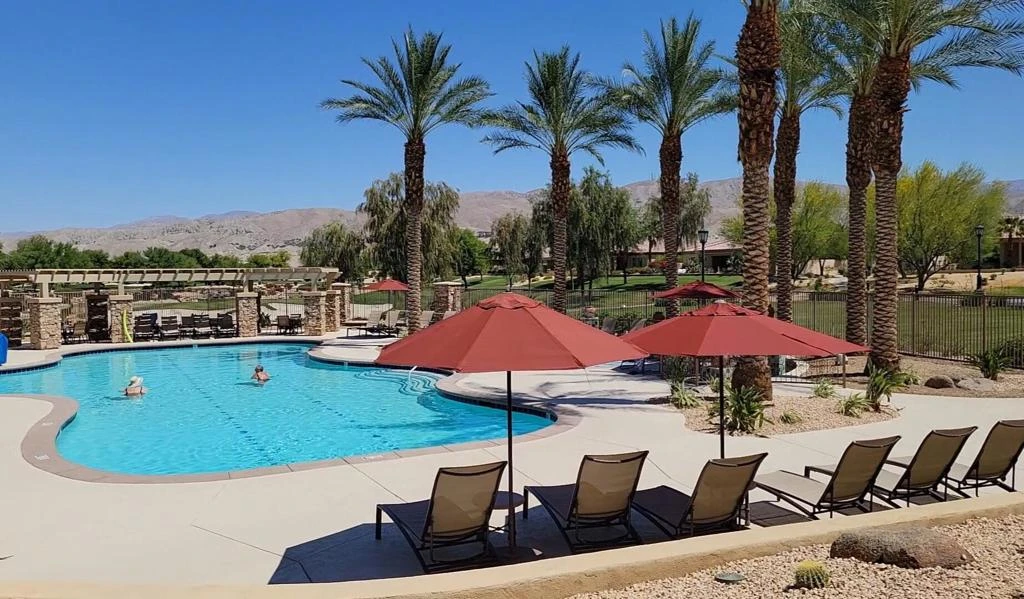 NOW AVAILABLE ALL MONTHS. 55+ community. You will love every inch of this 1,295 SF (EST.) Cordoba plan with the ideal two bedroom and two bath layout. The kitchen, dining area and great room is one wide open area with tile flooring and views of the rear patio and beyond. The kitchen has granite countertops, stainless steel appliances framed by rich dark cabinets w/pulls and a stool height island with a wrap-around counter that is ideal for entertaining. The home has plantation shutters on the windows and lighted fans on soaring ceilings. The primary bedroom has carpet flooring, dual vanities, a glass enclosed shower and a huge walk-in closet. Across the home, near the front entrance, is the guest bedroom and the guest full bath that has a shower over the tub. The finished laundry room has cabinets above and below the folding counter, a deep utility sink & an upscale washer and dryer. The two car attached garage has a whole house water softener, an evaporative cooler, storage cabinets on the floor, storage racks on the ceiling and a man door leading to a side-yard. The patio has a flagstone finished deck that has been extended beyond the covered portion to enhance your outdoor living enjoyment! An exceptional home!