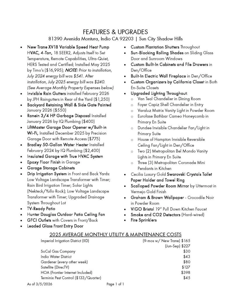 Experience elevated desert living in this highly upgraded, energy-efficient Retreat model with SUNROOM EXTENSION, POWDER ROOM, and GOLF CART GARAGE in Del Webb's premier 55+ resort community of Sun City Shadow Hills. Ideally located in the newest section of Phase 3 near the Santa Rosa clubhouse, the home has no rear neighbors, offering exceptional privacy, open sky views, breathtaking desert stargazing, and continuous bird watching. Enjoy your morning coffee relaxing on the comfortable OW Lee designer patio furniture included in the sale of the property and sip your evening wine gathered around the glass firepit with family and friends. This cozy veranda offers outdoor desert living at its finest. In the summer months, duck into the cool indoors to enjoy the new upgraded HVAC system with precise temperature control and quiet operation. The new TRANE XV18 variable-speed heat pump (2025) will provide peace of mind year-round generating very low energy costs (Summer IID Average: $227 2025 versus $445 2024). The interior showcases Italian porcelain tile set on the diagonal, PLANTATION SHUTTERS, 10-foot-high ceilings, upgraded lighting, and designer sun shades. The gourmet kitchen shines with granite slab countertops, stainless appliances, and custom open shelving. Both bedrooms feature luxurious en-suite baths and CUSTOM CLOSET ORGANIZERS by California Closets, while the Den features an in-wall FIREPLACE and custom built-in cabinetry, perfect for use as a home office. Installed in 2026, the following system upgrades include: garbage disposal; invisible rain gutters; garage door opener; freshly painted side gate/rear wall, and a newer water heater (2024). The insulated garage offers a true Trane A/C and heat, epoxy flooring, built-in cabinetry, and golf cart space. Outside, enjoy low-maintenance desert landscape enhanced with low voltage lighting, an expanded covered patio w/upgraded drainage system, all in a serene private setting ideal for relaxing or entertaining. PARTIALLY FURNISHED and move-in ready, this beautifully maintained home is the perfect blend of comfort, style, and easy desert living. Residents of Sun City Shadow Hills enjoy resort-style amenities including golf, pools, fitness, pickleball, and more--just minutes from Palm Springs dining, shopping, and entertainment.