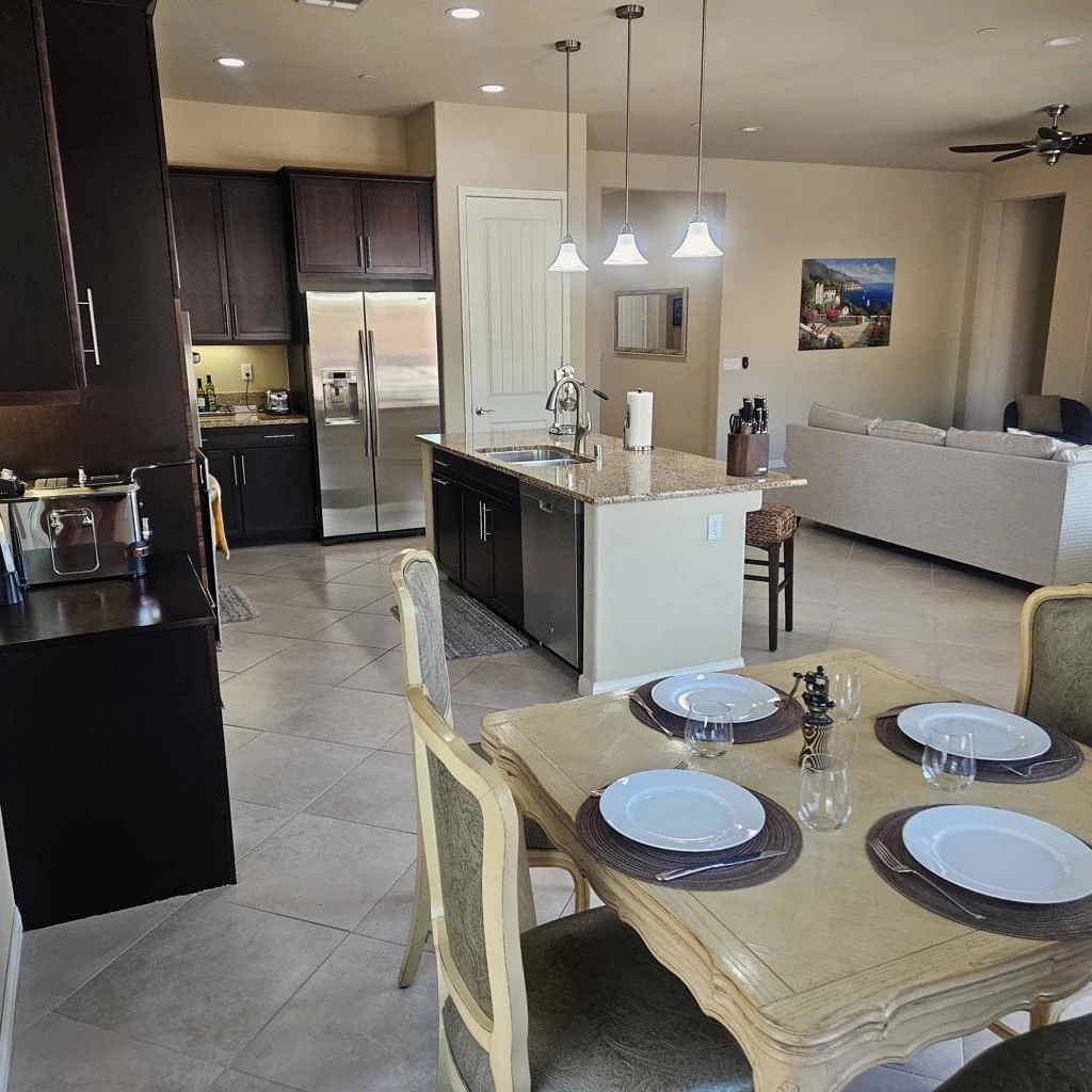 Enjoy all the comforts of home... 3 bedrooms, 2 bath Hospitality Model with a Open & Inviting floor plan, Spacious Great Room with a 65 Inch TV off Kitchen and Dining area, with slider door to access private North facing yard. Lovely Kitchen with Island, Granite Counter Tops. Spacious Primary Suite with King Bed, 55 Inch TV. Primary Bath with Dual sink vanity, separate tub & shower, walk in closet. Guest Bedroom with Queen sized bed, bath adjacent off hallway. 3rd Bedroom with Queen Bed & desk. Private yard with covered patio. Laundry room, 2 car attached garage. Phase 3 location, close to Santa Rosa Clubhouse, Shadows Restaurant, walking trails, golf, & Pickle Ball & Tennis! Close to shopping, dining, entertainment. Active Del Webb Lifestyle offers golf, restaurant, bistros, 2 clubhouses, indoor and outdoor pools/spas, Bocce, activities, concerts, performing arts, crafts, social events, Billiards, Library. Shopping, Dining, Entertainment, Acrissure Arena all nearby.