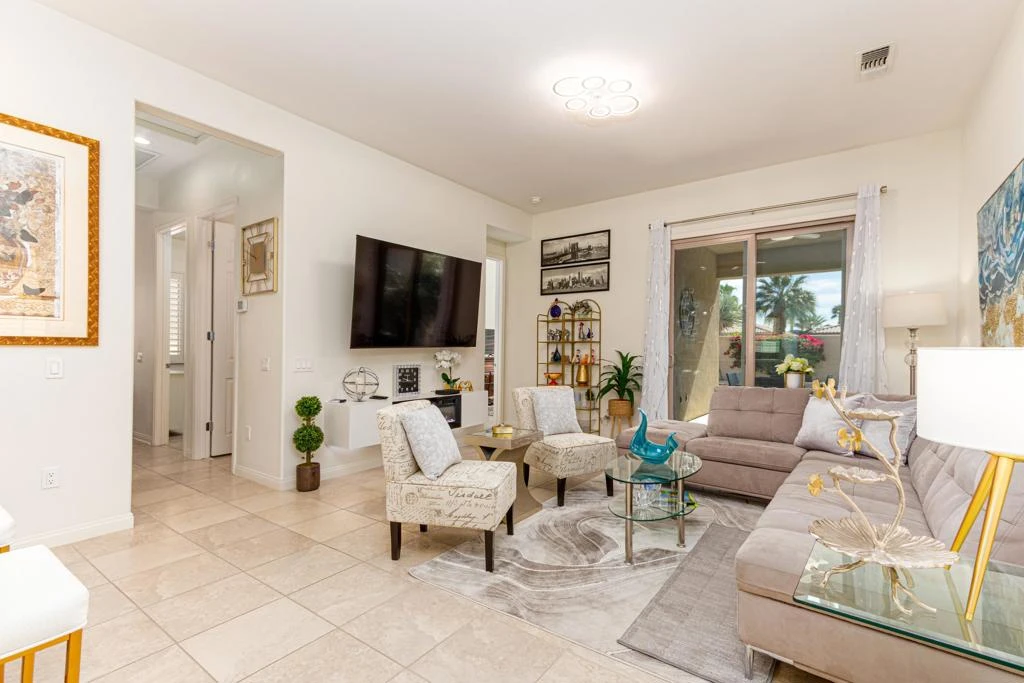 This beautifully remodeled home is move-in ready and packed with modern upgrades throughout. Featuring 2 bedrooms, 2 bathrooms, and a versatile den; complete with a custom tall barn door, and wardrobe for which the den can be used as a 3rd bedroom. This home offers both comfort and style. Enjoy brand new luxury vinyl wood flooring that complements the existing natural tile, creating a cohesive look. The entire home has been thoughtfully updated with recessed can lighting, four new ceiling fans, and new electrical outlets for added convenience. The spacious kitchen showcases stunning new quartz countertops, abundant cabinet space, and updated fixtures. In the living room, a sleek floating fireplace adds a contemporary touch of ambiance to the home. Additional upgrades include new faucets in both bathrooms and the kitchen, elegant window shutters, and energy efficient double pane windows. You can step outside to a low-maintenance backyard with artificial grass and a new sprinkler timer, perfect for easy outdoor enjoyment. The yard has been also beautifully manicured with rock and lush green trees reflecting our natural desert environment. Sun City Shadow Hills is an active lifestyle 55+ golf community that is surrounded by stunning mountain views. While exploring the grounds, you'll notice the meticulously kept Schmidt-Curley, Inc. design 18 hole golf course. Included in the breathtaking landscape are the beautiful ponds, which add nothing but tranquility to your day. Unwind in the clubhouse, a hub of weekly fun activities and connection, or visit the library to nurture your mind. Maintain mind and body health by using the fitness center or many other amenities which include: tennis, pickle ball, bocce and so much more. Call for more information.