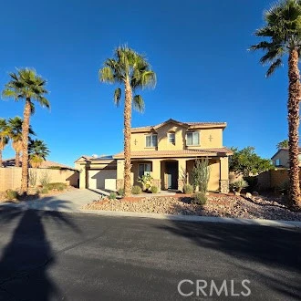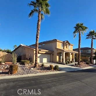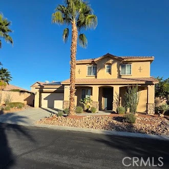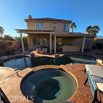 Located in the gated community of San Milan North in Indio, this solar-equipped home offers the largest floor plan in the neighborhood. The layout includes four bedrooms, a den or office with built-in cabinetry, a loft, and an interior laundry room with extra storage and a sink. Additional features include ceiling fans, recessed lighting, and custom window coverings throughout. The kitchen features granite countertops, ample cabinet space with under-cabinet lighting, and an island with bar seating that opens to the family room with a fireplace. The primary bedroom includes a walk-in closet, dual sinks, and a separate tub and shower. The front yard offers low-maintenance desert landscaping and a covered porch. The north-facing backyard is designed for easy outdoor enjoyment with a stamped concrete patio, built-in BBQ island with sink and refrigerator, fire pit, pool and spa with a shallow lounging area, citrus trees, and mountain views. Additional highlights include a four-car tandem garage with epoxy flooring and extra lighting, a whole-house water softener, evaporative cooler, and a leased solar system that helps reduce energy costs.