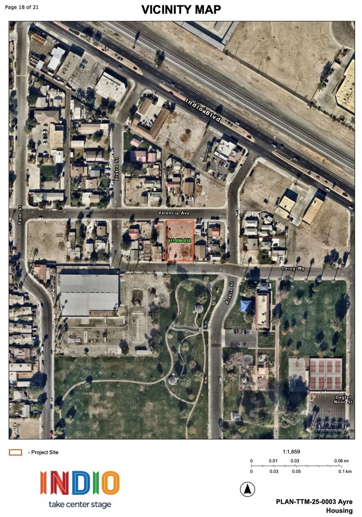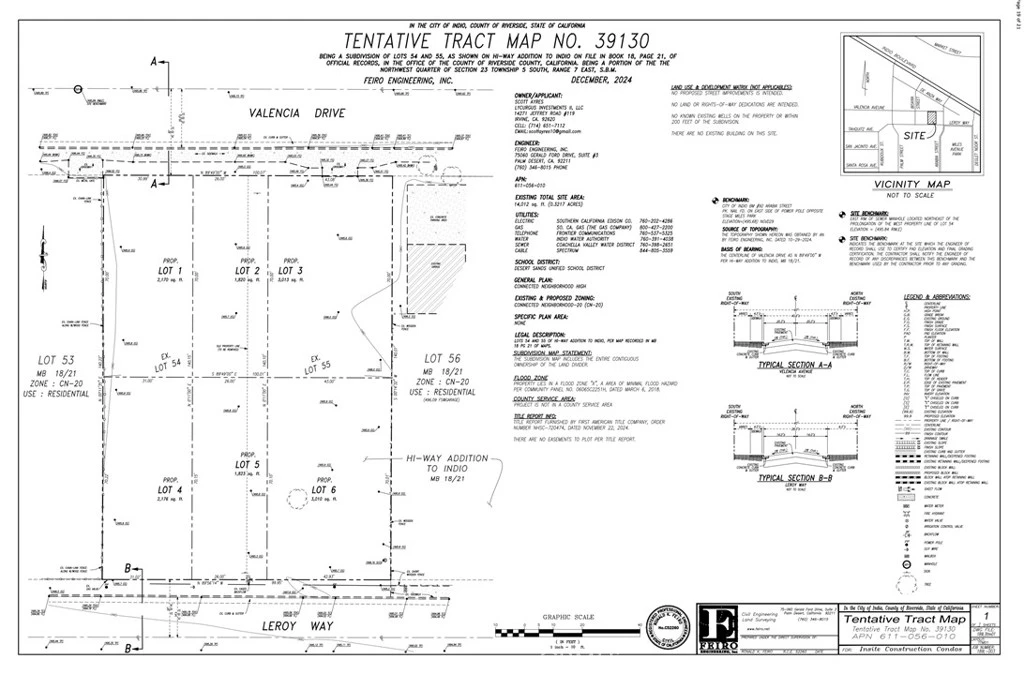 Unique opportunity to purchase 6 buildable lots on 0.32 acres near downtown Indio. Zoned for CN-20, Connected Neighborhood 20 which allows residential and mixed-use. The 6 lots could hold up to 18 total units if ADUs and JADUs were built on each lot. You could build on 3 lots, rent out 6 units, collect rent to pay your mortgage and live free in your own home. You then sell the other 3 lots individually and make a nice profit. There are lots of options with this tract map. Neighborhood is fully developed and utilities are right in the street making it very easy to build.
