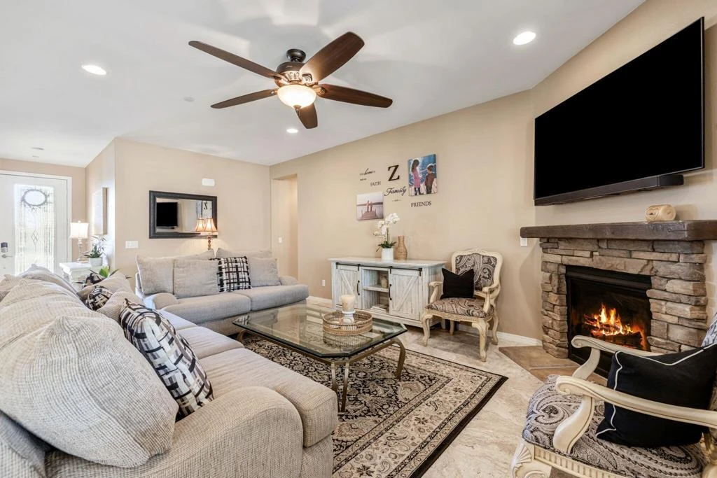 TRULY A MUST SEE! Nestled in the securely gated community of ALIANTE in North Indio, which is bustling with nearby shopping and dining, bordering Championship public golf courses, Terra Lago and Eagle Falls, and the Fantasy Springs Resort and Casino, with easy access to the I-10 freeway for convenient commuting.Within the gates of Aliante you will experience a community park with a playground, basketball courts, soccer field, barbecue grills for recreation surrounded by stunning mountain views plus low HOA fees.Step inside the charming designer door to an exquisite open concept living, dining and kitchen gathering area with cozy fireplace for entertaining family and friends with views of a backyard oasis with pool, spa and firepit for outdoor fun with multiple sitting areas....maintained impeccably!This 3 bedroom, 2 bath, plus an office/den, has a master suite with a large sitting area which can easily be converted back to a 4th bedroom. The 3 car epoxy floored garage can also be used as a exercise/flex/game room.The home is equipped with solar panels, low maintenance artificial turf, and exquisite landscaping with drip system and lighting front and back. The backyard patio has an alumawood patio cover and also a storage shed with a planting area.Come and see for yourself our comfortable and hard to describe home, so many extras included, and enjoy desert living under the stars!!!!FURNITURE AVAILABLE.