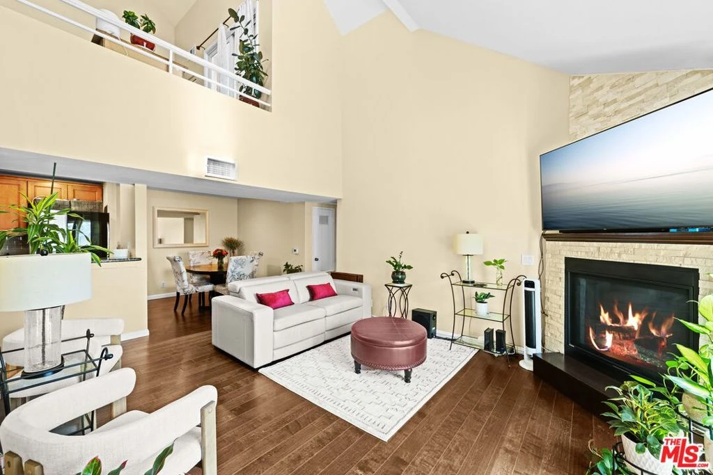 Welcome Home to this spacious townhouse-style condominium featuring two primary suites and an upstairs loft area that leads to a private roof-top patio. The main living area greets you with an amazing vaulted ceiling and beautiful hardwood floors. The living room has a beautifully remodeled corner fireplace and a west-facing balcony that allows natural light to flow into the space. The kitchen features new smart appliances and a newer full-size stacked washer/dryer is conveniently tucked away in a hall closet. Each en-suite has a spacious bedroom, walk-in closet, remodeled/updated bathroom and large vanity with plenty of storage and counter space. Upstairs, you will find a spacious loft area perfect for a home office with access to a private outdoor patio area, perfect for entertaining or relaxing. Bonus: New HVAC system, new paint, and noise reducing double pane windows throughout. Gated underground parking with two side-by-side spaces and storage above. The complex offers two pools surrounded by well-maintained, tropical landscaping for residents to enjoy. Area amenities: Minutes away from all the major entertainment venues the City of Inglewood has to offer: Kia Forum, SoFi Stadium, Intuit Dome, Hollywood Park Casino, YouTube Theater, Cinepolis Luxury Cinemas to name a few. The Village at Century shopping center houses: Costco, Target, Home Depot, as well as major grocery stores and restaurants. Don't miss this opportunity!