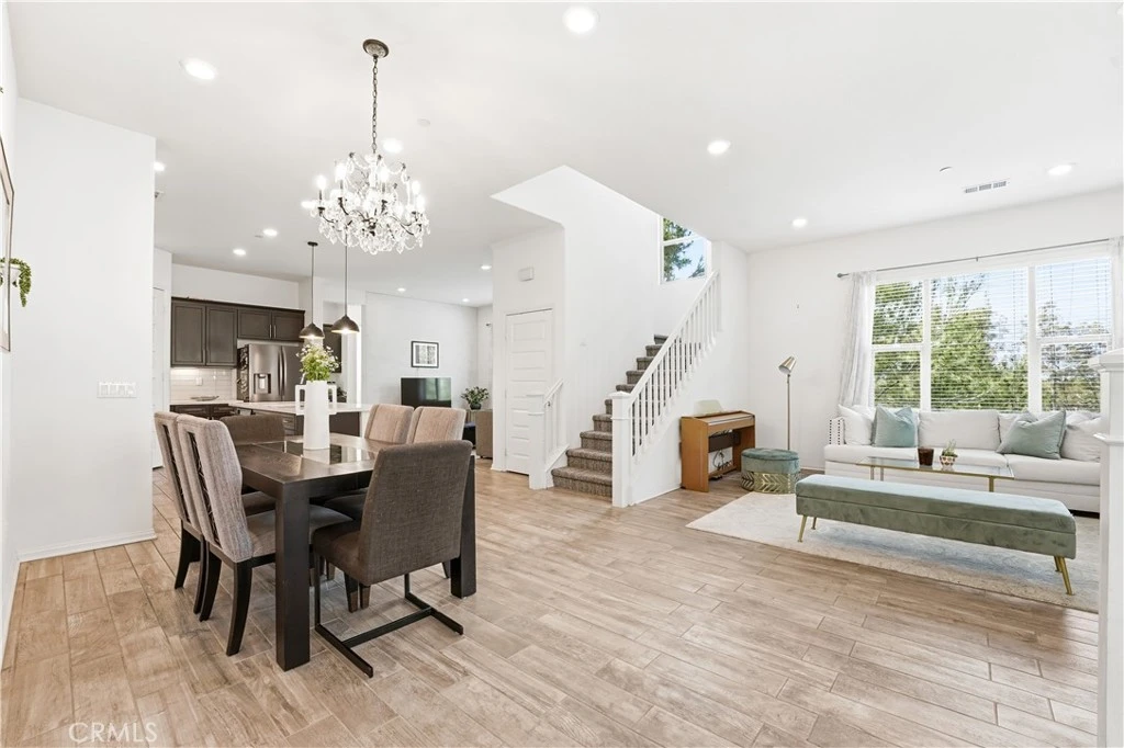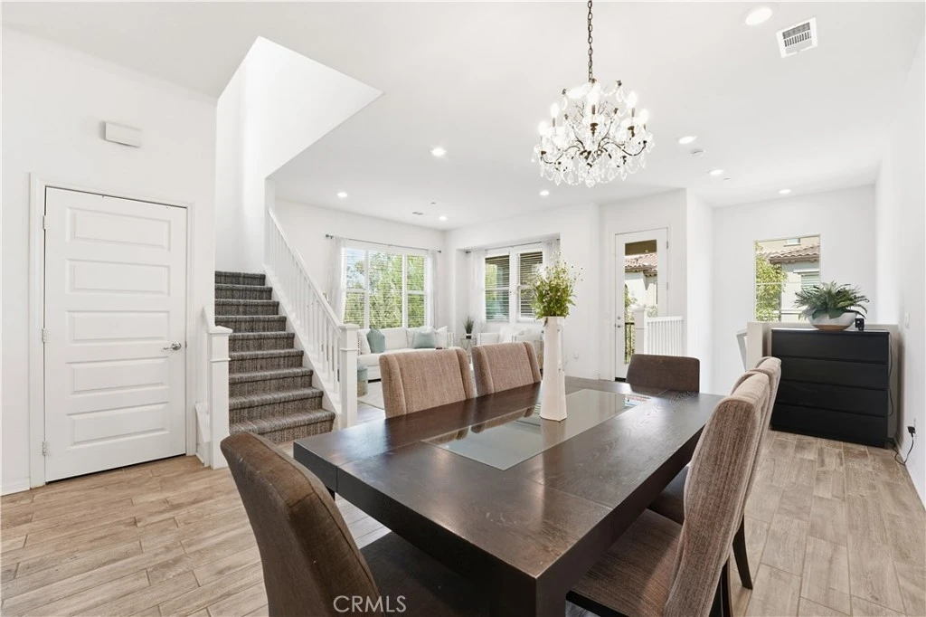 Built in 2016 and completely move-in ready, this stylish 3-bedroom, 3-bathroom tri-level condo offers a desirable end-unit location with beautiful hill and neighborhood light views. The home features bright white walls, LED lighting, soaring 10-foot ceilings, and elegant wood-look tile flooring, creating a modern and inviting atmosphere. The open-concept main level seamlessly connects the living room, dining area, family room, and kitchen, making it perfect for both everyday living and entertaining. The chef’s kitchen is designed for functionality and gathering, featuring a large center island with seating and a convenient pantry. One bedroom and a full bathroom are located on the main living level, providing flexibility for guests or a home office. The top floor includes the spacious primary suite, complete with a luxurious bathroom with dual sinks, along with the third bedroom and additional bathroom. Contemporary finishes throughout the bathrooms add to the home’s modern appeal. Large windows throughout the home bring in abundant natural light, while the high ceilings enhance the sense of openness and space. A covered balcony offers the perfect place to relax and enjoy the surroundings. The attached garage features epoxy flooring and direct access for added convenience. Located in the Willow collection of Portola Springs, the home is surrounded by three different resort-style pools and community amenities, including parks, playgrounds, and scenic walking trails. Residents also enjoy access to top-rated Irvine schools, nearby shopping at Woodbury Town Center, and outdoor destinations such as the Jeffrey Open Space Trail, Orange County Great Park, Irvine Spectrum, and Limestone Canyon Regional Park.
