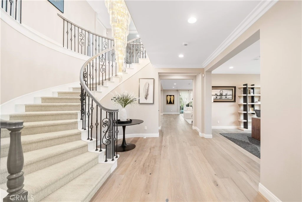 Premier Custom Residence in University Park | Rare Newer Construction in South Irvine Location Located in the highly sought-after University Park community in South Irvine, this extensively upgraded custom residence offers a rare opportunity to own a newer home in one of Irvine’s most established neighborhoods. Built in 2022, the home features quality craftsmanship, thoughtful design, and refined finishes throughout. A well-designed floor plan welcomes you inside. The main level includes two en-suite bedrooms with private entrances—ideal for multi-generational living or guests—along with a dedicated office and powder room. Interior highlights include a curved wrought-iron staircase, designer chandelier, and hardwood flooring throughout the first floor. The open-concept great room features expansive sliding glass doors that seamlessly connect indoor and outdoor living. The gourmet kitchen is equipped with glass display cabinetry, KitchenAid appliances, an oversized Sub-Zero built-in refrigerator, marble countertops, and a walk-in pantry. The dining area is surrounded by sliding glass doors and complemented by a wine refrigerator and storage. Upstairs, a spacious loft connects to a custom home theater, creating a flexible entertainment space. Four en-suite bedrooms are well-separated for privacy, including two primary suites: The primary suite 1 features double-door entry, dual vanities, a soaking tub, huge walk-in shower, and his-and-her walk-in closets with marble flooring. The primary suite 2 offers a private balcony and a multi-head shower for a spa-like experience.Two additional bedrooms are generously sized with highly upgraded bathrooms. The backyard is featuring a large California Room with built-in BBQ, refrigerator, and ventilation hood, plus a putting green. The flat, generously sized yard is a rare find in South Irvine. Additional features include fully paid solar, epoxy-coated garage flooring, natural stone hardscape in front and back yard, speakers , and a security system with surveillance cameras and alarm. Located in the award-winning University High School district and minutes from TVT. Walking distance to University Park Elementary, shopping and supermarket. Convenient access to UCI, golf courses, Newport Beach and major retail centers. Community amenities include pools, spa, tennis courts and sports fields.
