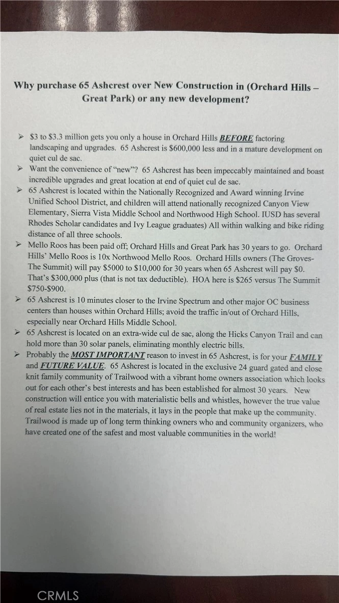 Thinking about buying brand-new construction? Read this first. Before you pay extra taxes, higher HOA fees, and wait months for completion, take a look at 65 Ashcrest. Welcome to 65 Ashcrest, a rare opportunity to own a spacious, beautifully appointed residence in the exclusive 24-hour guard-gated community of Trailwood. Combining timeless design, natural light, and an established neighborhood setting, this home offers the lifestyle many buyers hope to find—but rarely do. Spanning approximately 3,000 square feet, this thoughtfully designed home features 5 bedrooms plus a private office and versatile loft, along with 4.5 bathrooms, including a highly desirable main-level guest suite ideal for multigenerational living or visiting guests. An east–west orientation fills the home with warm natural light throughout the day, enhancing the open living spaces and creating an inviting atmosphere for both everyday living and entertaining. The surrounding community is known for its mature landscaping, tree-lined streets, and tranquil ambiance—a refreshing alternative to newly built developments. Residents of Trailwood enjoy access to two resort-style swimming facilities, including one within the guard gates and another at nearby Meadwood Park, offering exceptional recreation just moments from home. Located within the National Blue Ribbon Award–winning Irvine Unified School District, the home is also uniquely positioned with all three neighborhood schools less than one mile away, making daily life both convenient and connected. Adding to the community’s charm is the beloved annual Trailwood Harvest Festival, where residents gather for games, bounce houses, a petting zoo, face painting, and complimentary food—creating a true neighborhood experience that is increasingly rare. With no Mello-Roos taxes, HOA dues under $300 per month, and the security and prestige of a guard-gated enclave, 65 Ashcrest offers a compelling blend of value, luxury, and community. A home where elegance meets lifestyle—welcome to Trailwood.