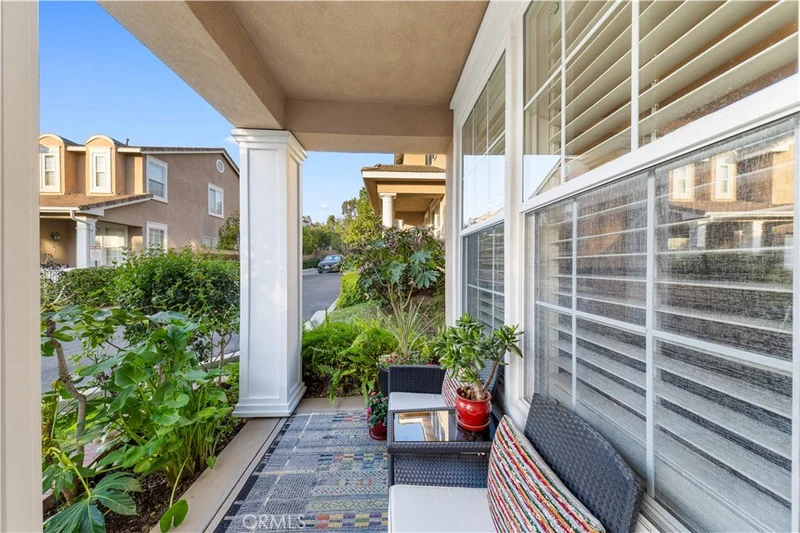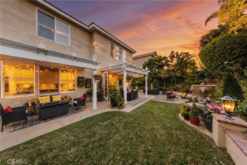 Located in the highly desirable gated community of Georgetown at Northwood Pointe in Irvine, this beautifully maintained home offers privacy, charm, and tasteful upgrades throughout. The true highlight of the property is its exceptional backyard retreat, designed as a private garden oasis. Surrounded by lush landscaping and mature trees with no rear neighbors, the yard features manicured greenery, colorful flower beds, and a peaceful lawn. Perfect for entertaining or relaxing, the space includes a wood trellis-covered dining area with sun shades, a cozy seating area, pebble stone fire pit, and a charming garden fountain, all framed by stone-lined planting beds that create a tranquil outdoor setting. Inside, the home offers warm character and thoughtful design. The first floor features wood flooring throughout, while the kitchen provides abundant cabinetry and sliding glass doors opening directly to the backyard, allowing natural light to fill the space. The living room showcases a full wall of windows overlooking the garden, a central fireplace, and custom-built-in cabinetry. Upstairs, a staircase highlighted by a statement chandelier leads to the bedroom level with upgraded carpeting. The spacious primary suite enjoys calming views of lush greenery, while the primary bathroom features dark hexagon tile flooring, elegant lighting, a separate soaking tub and walk-in shower, and a walk-in closet. One secondary bedroom includes a private balcony, while the additional bedrooms offer walk-in closets, ceiling fans, crown molding, and plantation shutters throughout. Additional highlights include a driveway and an organized garage with storage systems and cabinetry. Combining tasteful interior upgrades with a beautifully designed private garden, this home offers a rare opportunity to enjoy peaceful living in the prestigious Northwood Pointe gated community.