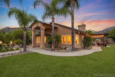 The Boulder House is a forward-thinking green home and a rare creation by Hubbell & Hubbell, the acclaimed father-and-son team of the late celebrated artist James Hubbell and his son, architect Drew Hubbell. Recognized with architectural honors and featured in multiple publications, including The Los Angeles Times, this residence stands as both a work of art and a pioneering model of sustainable living. Blending artistry with innovation, the home features new ceramic tile floors, custom tile work, vaulted ceilings, and arched windows that flood the open layout with natural light. At its heart, the residence is literally built around a 14 -foot natural boulder, a dramatic centerpiece in the great room that cools and humidifies in summer and radiates warmth in winter. Above, a central tower fan enhances airflow, drawing heat up and out in warmer months and recirculating warmth in cooler seasons. Roof overhangs and arched arcades minimize solar gain while honoring California’s historic mission style. Super-insulated straw bale walls act like a thermos, keeping interiors comfortable year-round while exceeding California’s Title 24 standards by 41 percent. Recent upgrades include a newly re -plastered pool, freshly recoated exterior limestone, a new high-efficiency tankless water heater, new water softener, new well pump and renewed septic. Privately set against protected land and a wildlife sanctuary, the property offers unmatched seclusion, sweeping mountain views, and timeless architectural design.