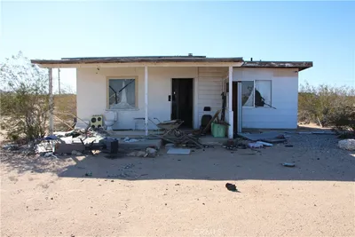 Mid-Century cabin seeks architect, artist, contractor or creative person to bring back to life! As is, where is, present condition sale Cash or Owner May Carry Financing terms only. Sold home comps 3 blocks away recently closed for $630,000 for a small 1,350 square foot home. Current listings with the Twentynine Palms zip code on market for $550,000+. Plenty of room for a designer or builder to make a dream home or flip. This is the furthest north of North JT where dirt roads and 4x4 country are the norm. Property features a 5-Acre lot with Gov Open Space / BLM land on 3 sides of property that connects to a patchwork of several hundred acres of open space land for horses, hikes, ATV riding, and dog walking. County says property can be rehabbed with plans. Owner started plans but never finished. Property is down to the studs. Electricity was connected and pole on property ready to be re-connected. Water meter on and functioning. Joshua Tree is becoming an internationally know community with a high demand for luxury ranches and privacy. Invest in the future. For any questions on zoning, usage, remodel permits, etc. Please contact the San Bernardino County Planning Dept and provide APN: 0632-141-18-0000 for all rehab and development questions. Paid plans to be transferred to Buyer through Escrow only. Finish project or use them to expand your dream vision. Priced to sell!