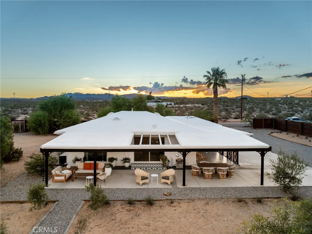 This FULLY FURNISHED 3-bedroom, 2-bath rustic-modern compound rests on 3.51 acres in scenic Joshua Tree. Set on the mesa and fully fenced for privacy, the property offers sweeping views of the surrounding hills and mountains along with a tranquil desert atmosphere. Thoughtfully renovated, the home features polished concrete floors, white wood-paneled walls, skylights, and sliding glass doors in the bedrooms that fill the interiors with natural light. The open-concept kitchen, ideal for entertaining, includes a large island, sleek black cabinetry and fixtures, granite countertops, and a tile backsplash. The adjoining living area with large slider overlooking the backyard is enhanced by vaulted ceilings and exposed beams. Both bathrooms have been stylishly updated with tiled walk-in showers and contemporary lighting. Comfort and efficiency are ensured with Mitsubishi mini splits, upgraded electrical, a new water heater, and full gutters. Outside, a generous covered patio invites relaxation and gatherings, accented with rattan light fixtures and black-and-white Aztec tile at the entry and steps. A detached cedar shed with a covered porch, dedicated power, vinyl flooring, extra fridge, and lighting offers versatile use as an art studio, office, or yoga space. The property also includes an RV electrical hookup, ample parking, and a Tuff Shed for added storage. The L-shaped lot features paved road frontage and a side gate off Shifting Sands Trail—perfect for a potential second dwelling with private access. Outdoor highlights include two water meters, a pool with custom wood decking, a hammock circle, and mature, drought-tolerant landscaping with olive, acacia, pepper, and palo verde trees, as well as agave and cacti. Freshly graded trails at the rear provide a great way to explore the land by foot or even on horseback. Located just 15 minutes from Joshua Tree National Park, under 10 minutes to downtown, and less than 5 minutes from the Noah Purifoy Outdoor Art Museum, this one-of-a-kind desert retreat offers a rare blend of style, space, and location. Schedule your showing today!
