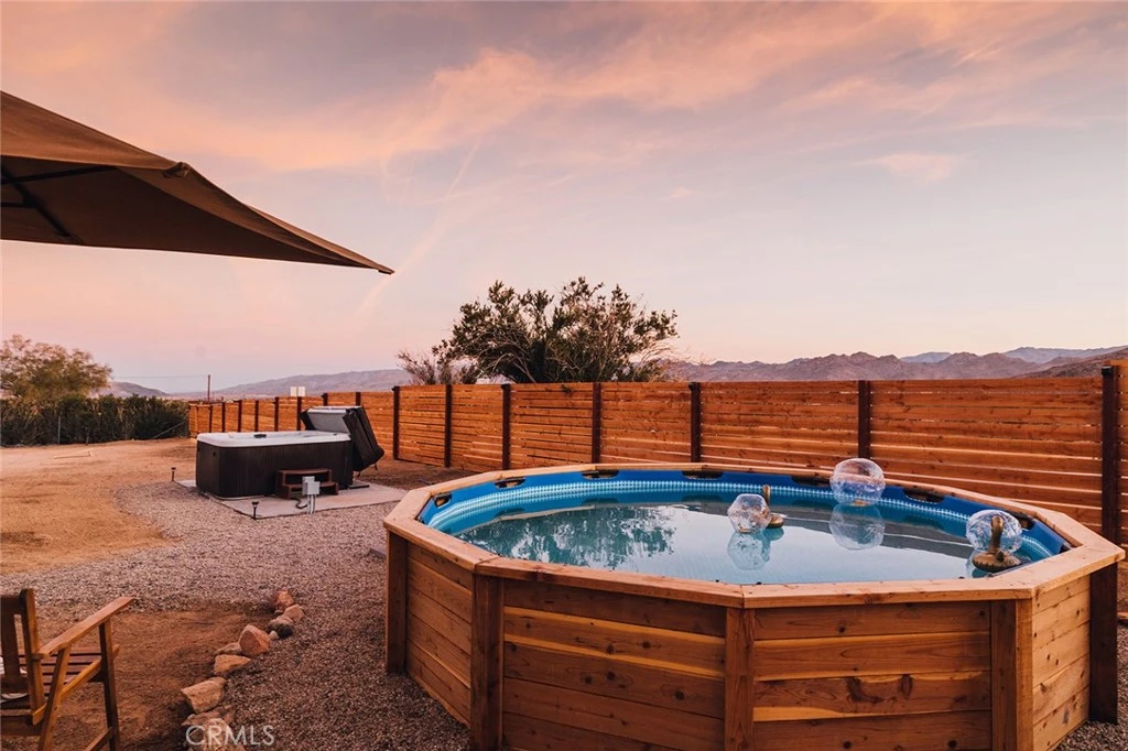 Your home search ends here! This stunning home near Joshua Tree National Park is a rare find. Completely redesigned and upgraded in 2022, this home seamlessly blends modern comforts with the tranquility of desert living. Perched atop a hill on a sprawling 19,425 sq. ft. corner lot, this retreat boasts breathtaking 180-degree desert views—the perfect backdrop for relaxation and entertainment. The backyard is a private sanctuary, designed for unforgettable experiences under the iconic Joshua Tree night sky. Enjoy an above-ground pool, hot tub, fire pit, and a row of hammocks—perfect for unwinding. The dedicated yoga studio and meditation room elevate this home into a true wellness retreat. An outdoor shower adds convenience after a day of hiking or lounging in the pool. Inside, the spacious primary suite offers its own ductless mini-split AC/heat system for year-round comfort. The attached luxurious ensuite features a massive walk-in shower with dual rain shower heads and a double vanity—a true spa-like escape. The remodeled kitchen includes newer appliances, ample counter space, and an open-concept layout that seamlessly connects to the living room. French doors lead to an outdoor dining area, complete with a large dining table, BBQ, and a welcoming space to gather with family and friends. A sought-after destination for retreats, family reunions, girls’ trips, and more, this property offers the perfect blend of luxury, privacy, and the natural beauty of the desert. Whether you're looking for a vacation home, second home, or a peaceful retreat, this is an opportunity you don’t want to miss!