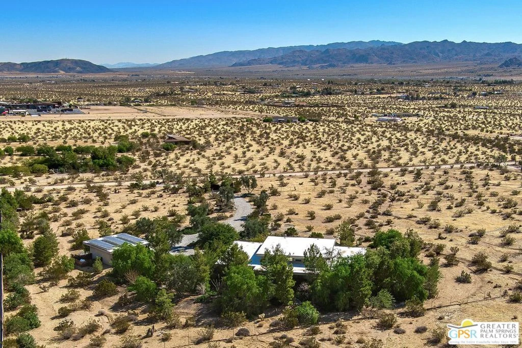 Desert Horizon House is a sophisticated desert retreat set within a private botanical garden of sculptural desert plants designed by a renowned Los Angeles landscape architect. This home is a modern sanctuary where architecture and nature blend perfectly. The stunning location is enhanced by the magical garden that completely envelops the house, complementing its position on the desert floor. Located on an expansive lot, this newer home has breathtaking, unobstructed views of the desert landscape, nearby hills, and distant mountain ranges. Both sunrise and sunset here are unforgettable, bracketing perfect desert days and nights. The property is located moments from Joshua Tree National Park. A custom metal gate opens to a fully fenced estate where meandering pathways, mature trees, and vibrant plantings create a tranquil retreat for nature and bird lovers alike. Inside, the home showcases soaring cathedral ceilings and an airy, minimalist design that emphasizes light, space, and flow. Thoughtfully designed for efficiency, the home features an owned solar energy system that ensures sustainable comfort year-round. Expansive glass sliders on both sides of the main living area invite seamless indoor-outdoor living, allowing the desert breeze to drift through and connect every room to the natural beauty beyond. A testament to refined desert living, Desert Horizon House is the perfect high desert home.