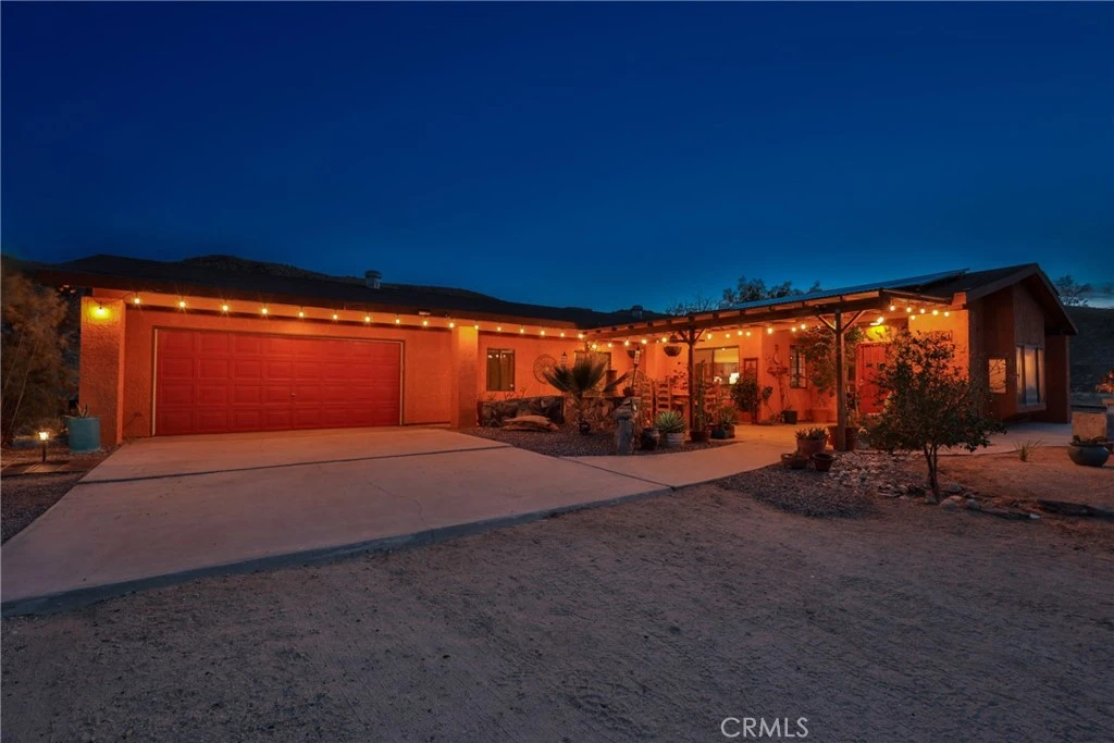 HUGE PRICE DROP! This exciting 2 bedroom 2 bath plus office home has everything: huge 1.25 acre fully fenced lot, full-length covered rear patio with outdoor kitchen, pond and waterfall,new luxury swim-spa and hot tub, outdoor TV and endless views. The Master Suite features a rockwork accent wall, sliding doors out to the patio and lots of storage. The open chef's kitchen has black granite counters, lots of storage and light and a convenient granite topped island. The guest room has its own en-suite bathroom and is adorned with amazing jungle murals with hidden animals and surprises. In addition to central air and heat, there is a substantial PV solar system and the family room has a super economical pellet stove. Within minutes from Joshua Tree Village, Joshua Tree National Park and schools, the well maintained California ranch house allows spacious privacy and easy access. The small office space with slider to patio is currently used as a third bedroom. Two full-size shipping containers (Conex boxes) and a storage shed come with the property. The septic is less than two years old, and there is also a full house water filtration system. All the outdoor and indoor kitchen appliances come with the house, and almost all the outdoor furniture stays. One look and you'll fall in love!