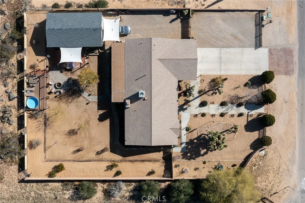 Large three-bedroom, two-bath home with an attached two-car garage and an additional detached 700 sqft garage, situated on a spacious corner lot in Joshua Tree. This fully fenced property has been beautifully landscaped in both the front and backyard, offering privacy, functionality, and impressive curb appeal. As you arrive, you’ll notice the mature landscaping, large concrete driveway, and drive-thru gate providing ample space for RV storage or additional toys. Block wall privacy fencing enhances the yard, while a concrete walkway leads you to the front door where a newly built deck captures gorgeous views of Joshua Tree National Park and downtown Joshua Tree. Inside, you are welcomed by a remodeled kitchen featuring newly finished cabinets, updated backsplash, stainless steel appliances, generous storage, and abundant counter space. The large living room offers plenty of space for gathering and includes a cozy gas & wood-burning fireplace. The home features a split floor plan with a spacious primary bedroom that includes two closets and an ensuite bathroom with a large dual-sink vanity, ample storage, and a beautifully remodeled walk-in shower with modern tile finishes. The two additional bedrooms are well-sized with plenty of closet storage, and the second bathroom is conveniently located with a shower-tub combo and all the essentials. The backyard is packed with amenities designed for enjoyment and entertaining. A very large covered patio provides shaded outdoor living space, while a standalone deck offers room for seating and currently accommodates a cowboy pool, all with phenomenal mountain views. Additional features include a fire pit area, mature shade trees, a hammock space, and another shaded deck. The 700 sqft detached garage offers extra storage and includes a sectioned-off area currently used as a man cave. RV hookups are also in place. This home features dual cooling with both central HVAC and a ducted evaporative cooler. Truly turnkey and ready to go, this property offers an exceptional location close to downtown Joshua Tree, the entrance to Joshua Tree National Park, and everything the area has to offer.