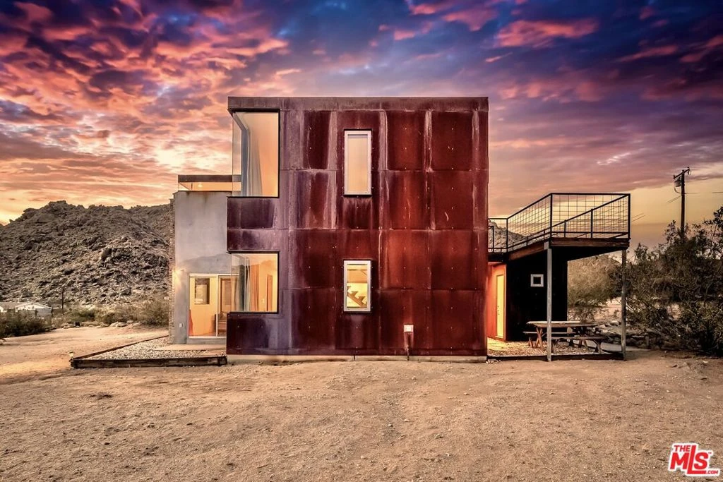 First time on the market: the prestigious Rotohouse, in the exclusive Monument Manor neighborhood of Joshua Tree, California. This organic architectural treasure is just a mile to the entrance of the popular Joshua Tree National Park, sitting between two large mounds of boulders enhanced by spectacular sunset vistas. House designed by world-class architect Michael Rotondi in 2007 and renovated over the course of 10 years. The main entrance is through a custom glass door entering a fun open-air atrium. The sophisticated floorplan incorporates 2 stories 1,845 sq feet, with 10ft. ceiling in the upstairs bedroom and 14ft. high opening on downstairs bedroom, three bathrooms, two in the master suite, his and hers. Characterized by simple forms and open volumes, the main addition is a cube 25 feet on each side. Adjacent to that is a long, narrow storage building with a roof deck pointing to a phenomenal spectacle of heaped rocks and sexy Pinto Mountains. Raw and handcrafted, the rugged exterior wrapped in corten steel set the trend for hi-desert buildings. Mondo central air eases extreme desert climate offering perfect comfort throughout. Every custom window frames extraordinary and enchanting wild desert scenery. The included adjoining 2.5 acre parcel is priceless on it's own. It offers the perfect location for a potential second epic dwelling; perhaps on piers, so as to offer infinite vistas east and west. With this purchase you are not just buying a house but the true character that inspires the Joshua Tree nature and lifestyle.